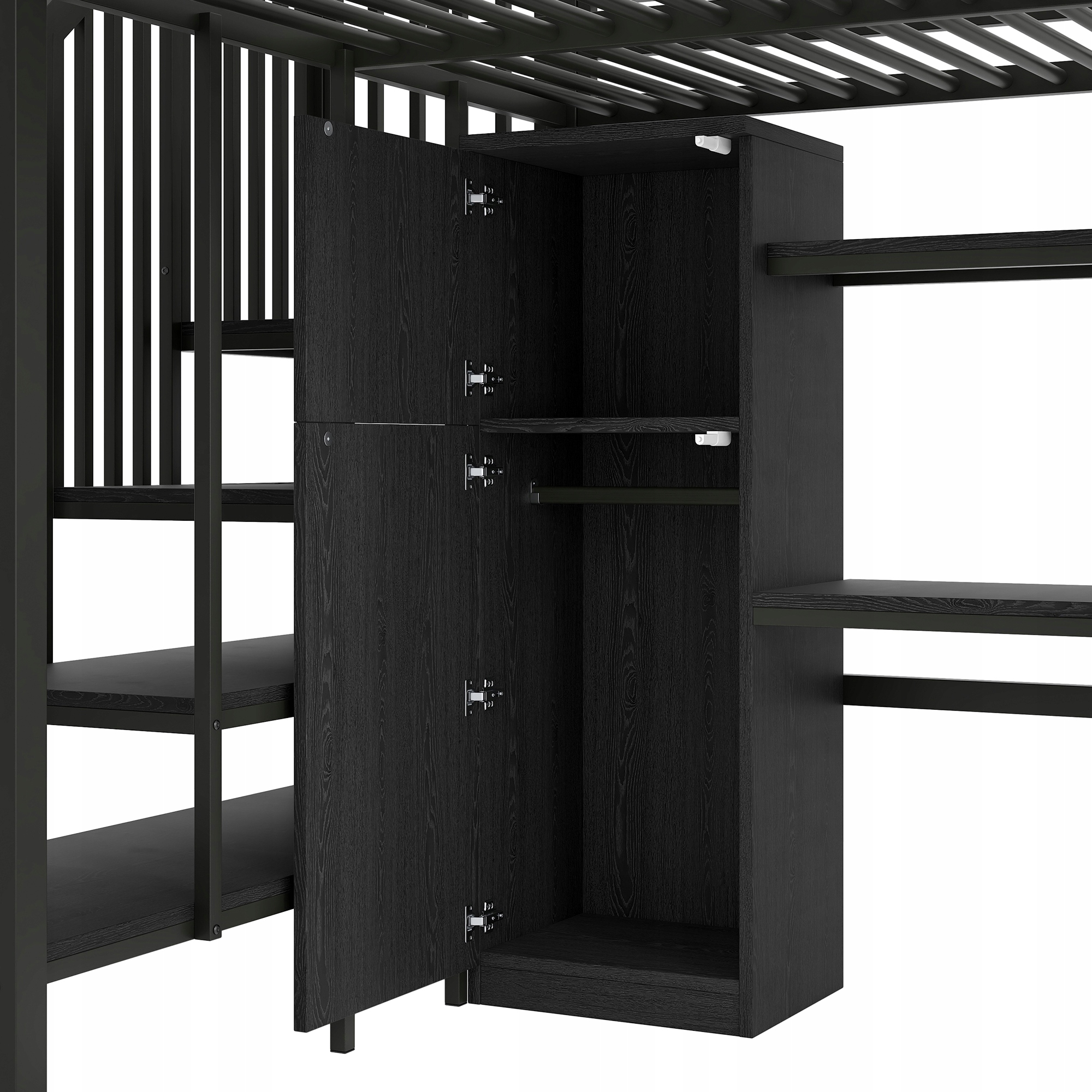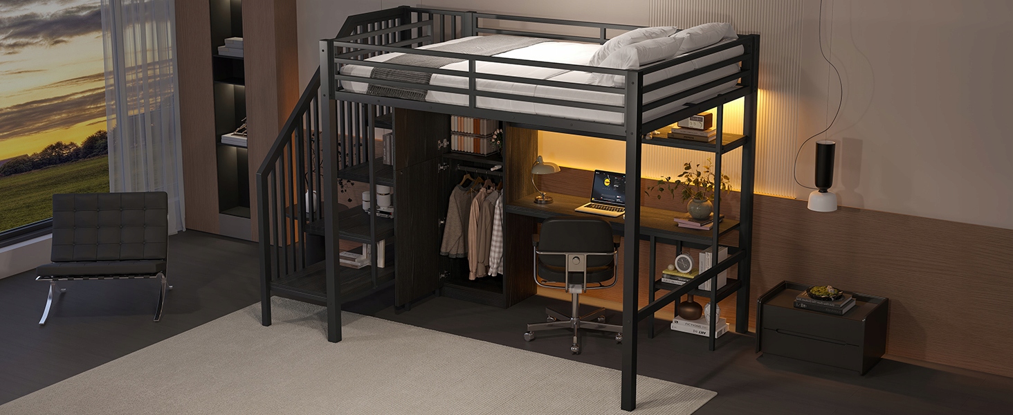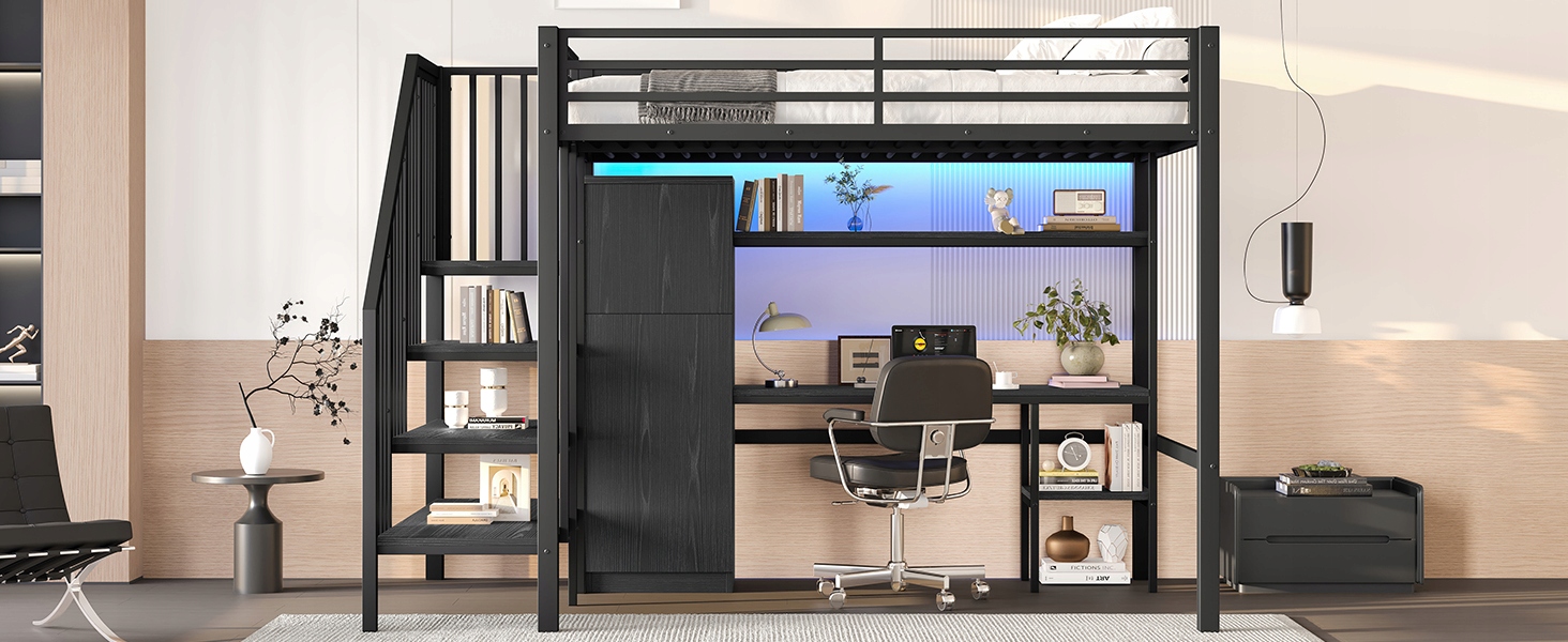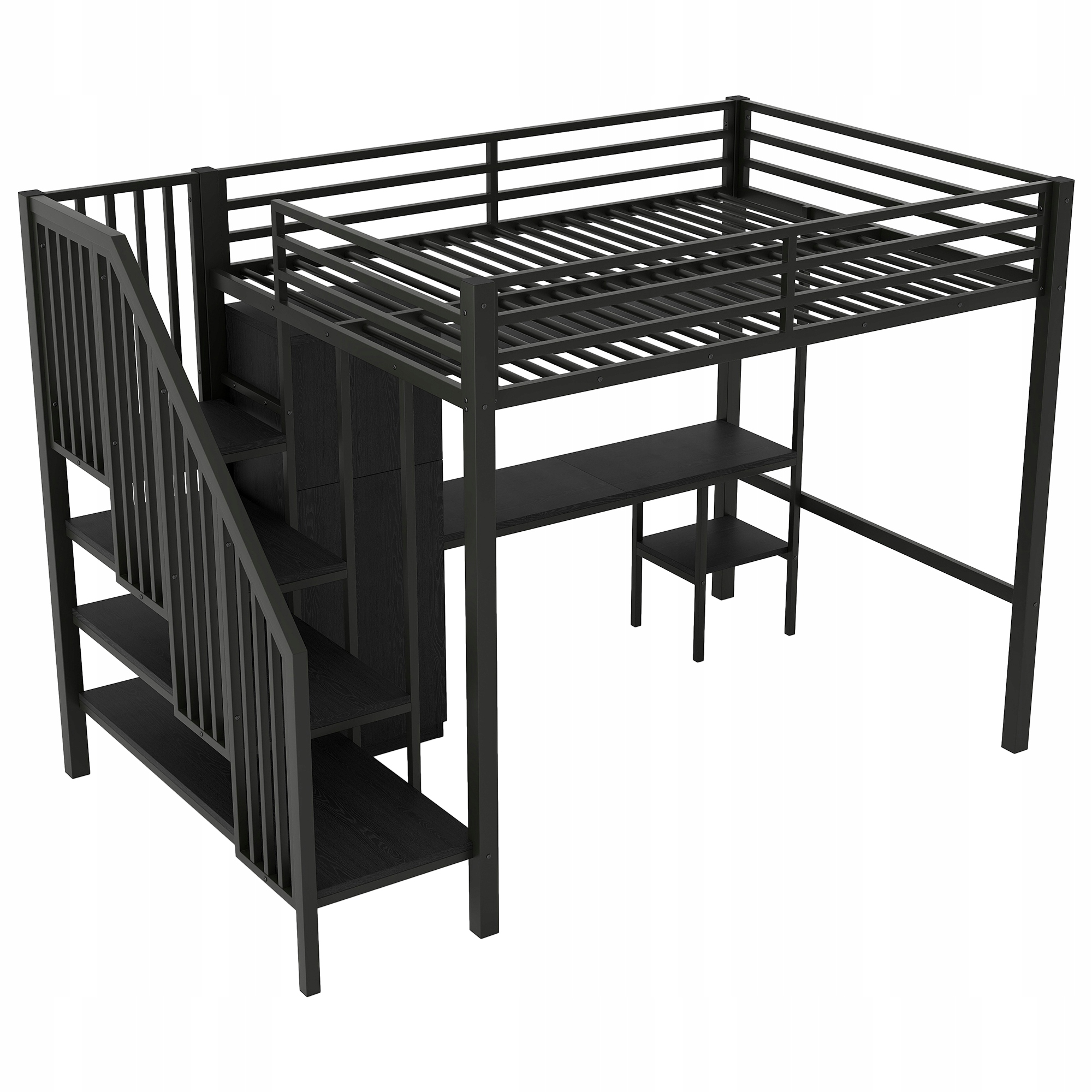 Ліжко двоярусне металеве 140x200 зі столом, полицею, шафою та сходинками для речей, чорний