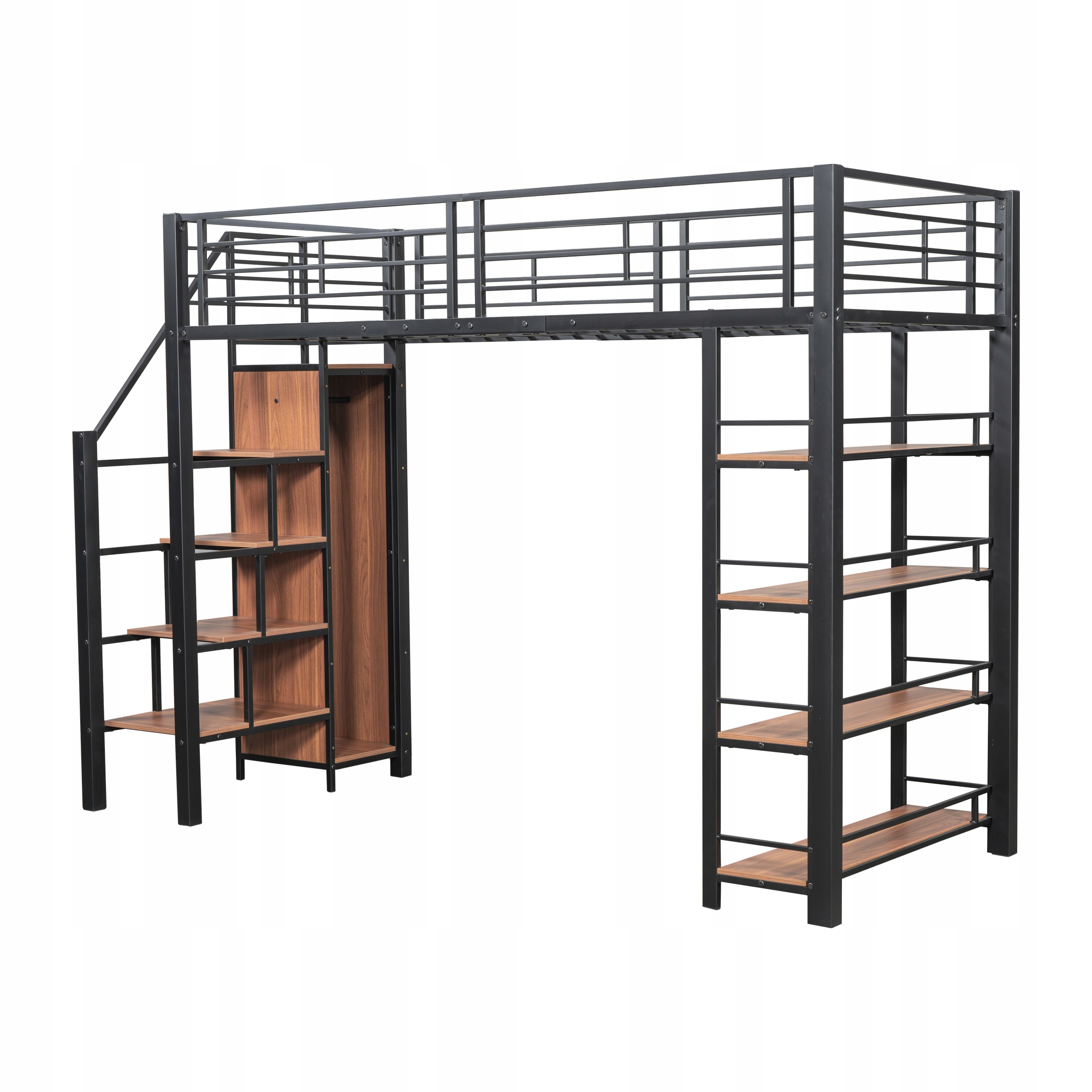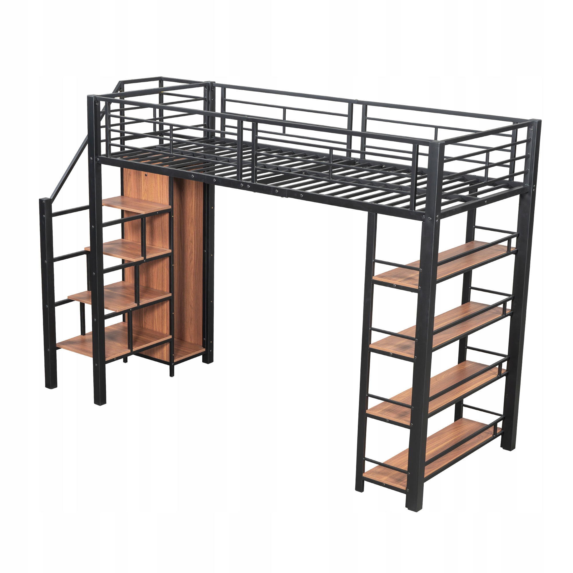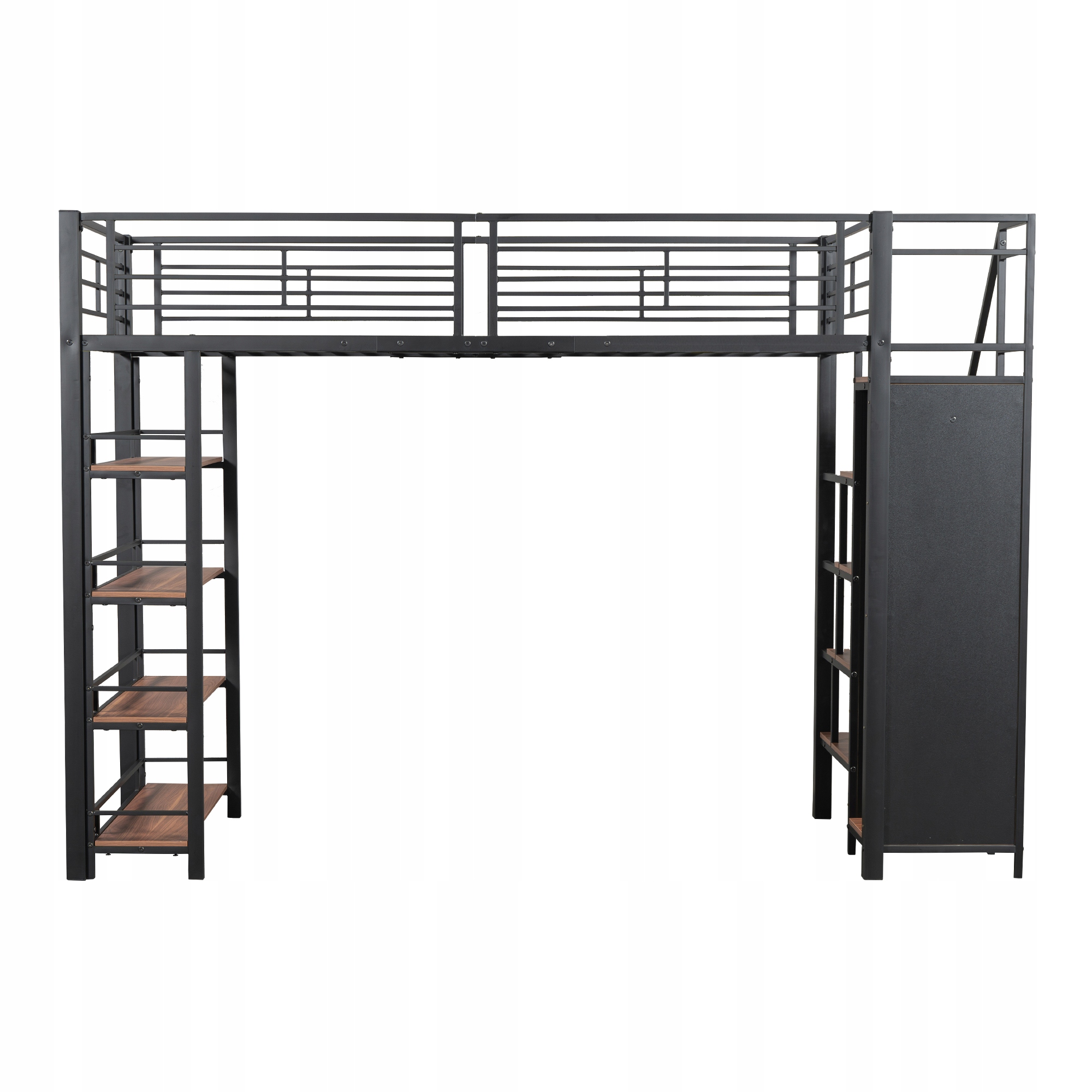 Ліжко-горище 90*200, з захисними сходами, місцем для зберігання та невеликою шафою, стелажами, високою огороджувальною конструкцією, ліжко односпальне, ліжко молодіжне, чорний