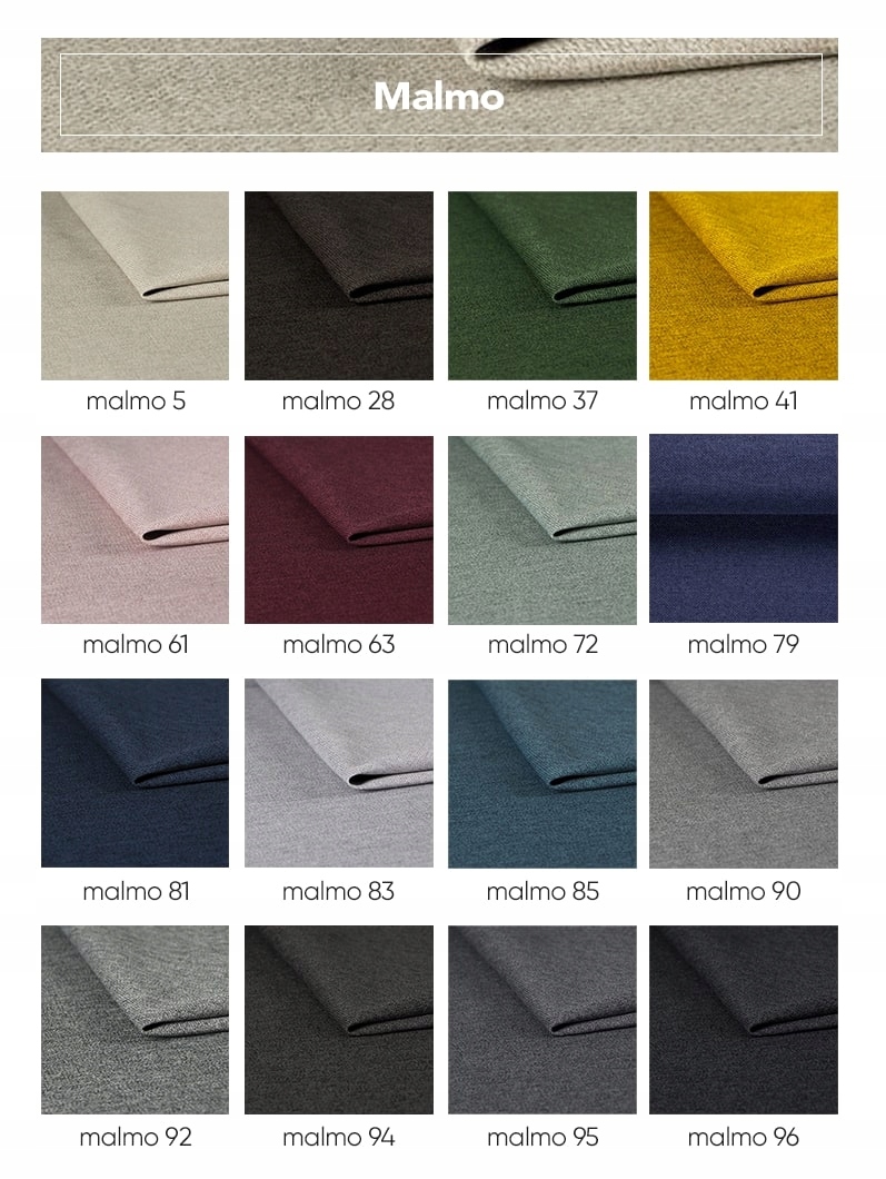 - MALMO (структура) - Тканина MALMO належить до групи плетінок, які відомі своєю довговічністю. Malmo також стійкий до пілінгу та зміни кольору, викликаного штучним світлом. Таким чином меблі з цим оббивним матеріалом довше зберігають свій гарний зовнішній вигляд.