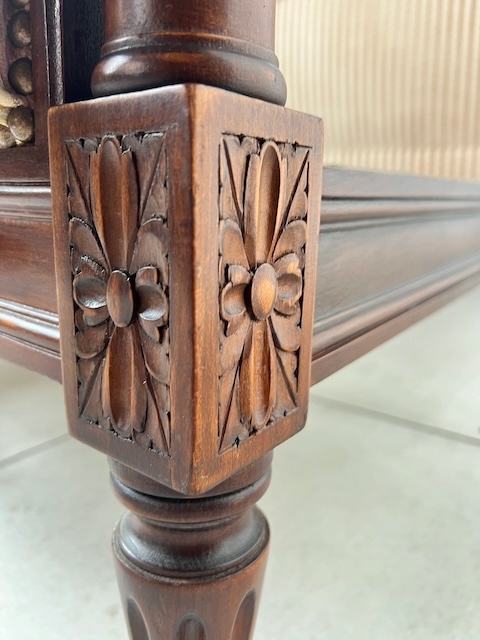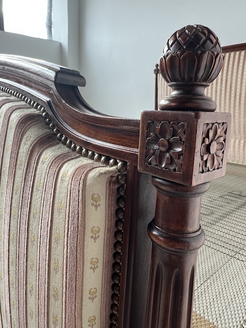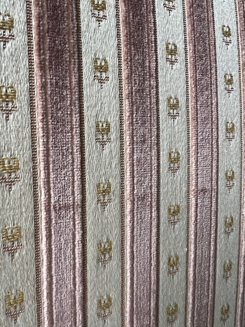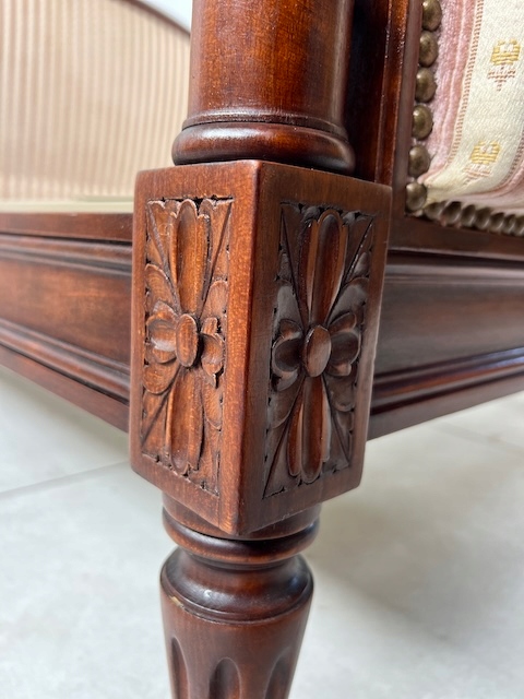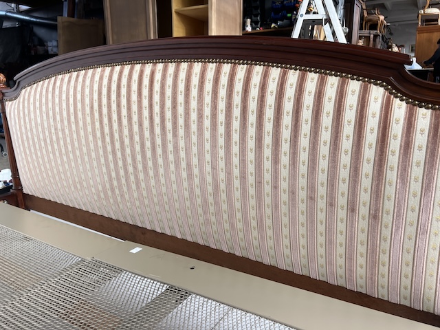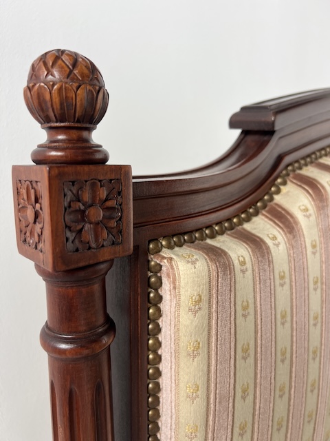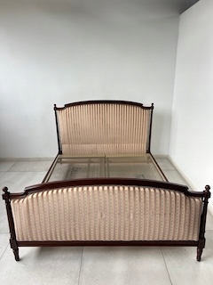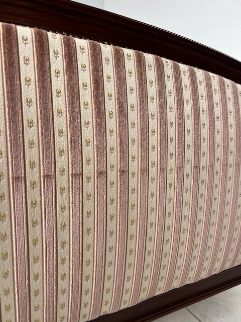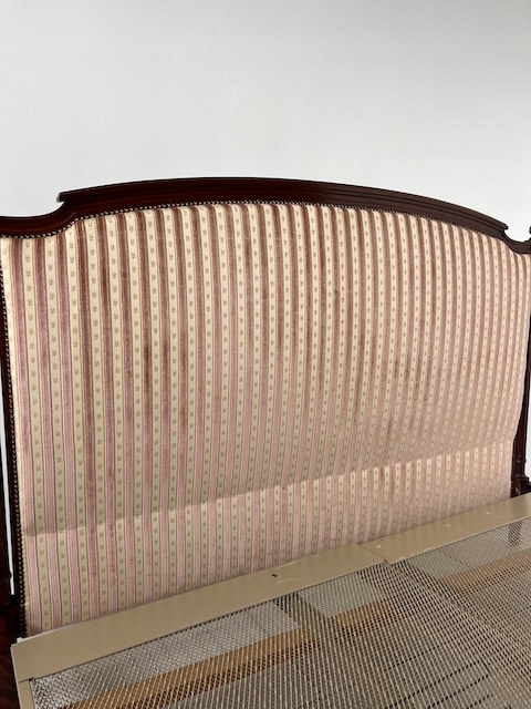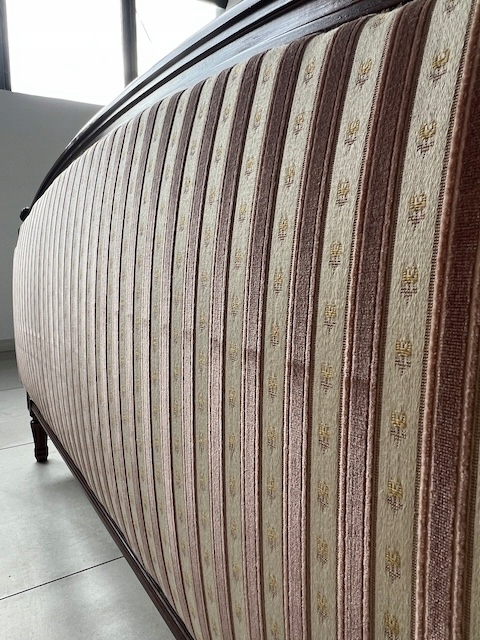 Стильне ліжко з дуба. Гламурний; красиво оформлений. Оббитий елегантним жаккардом з кремовими та бежевими смугами. Є типові ознаки використання, але добре збережений. Його стан детально видно на фото. Тканина чиста. Ліжко міцне. Продається в комплекті з рамою. Вам потрібен матрац шириною 160 см. За нашими оцінками, він походить з другої половини 20 століття. Ліжко готове до розміщення.