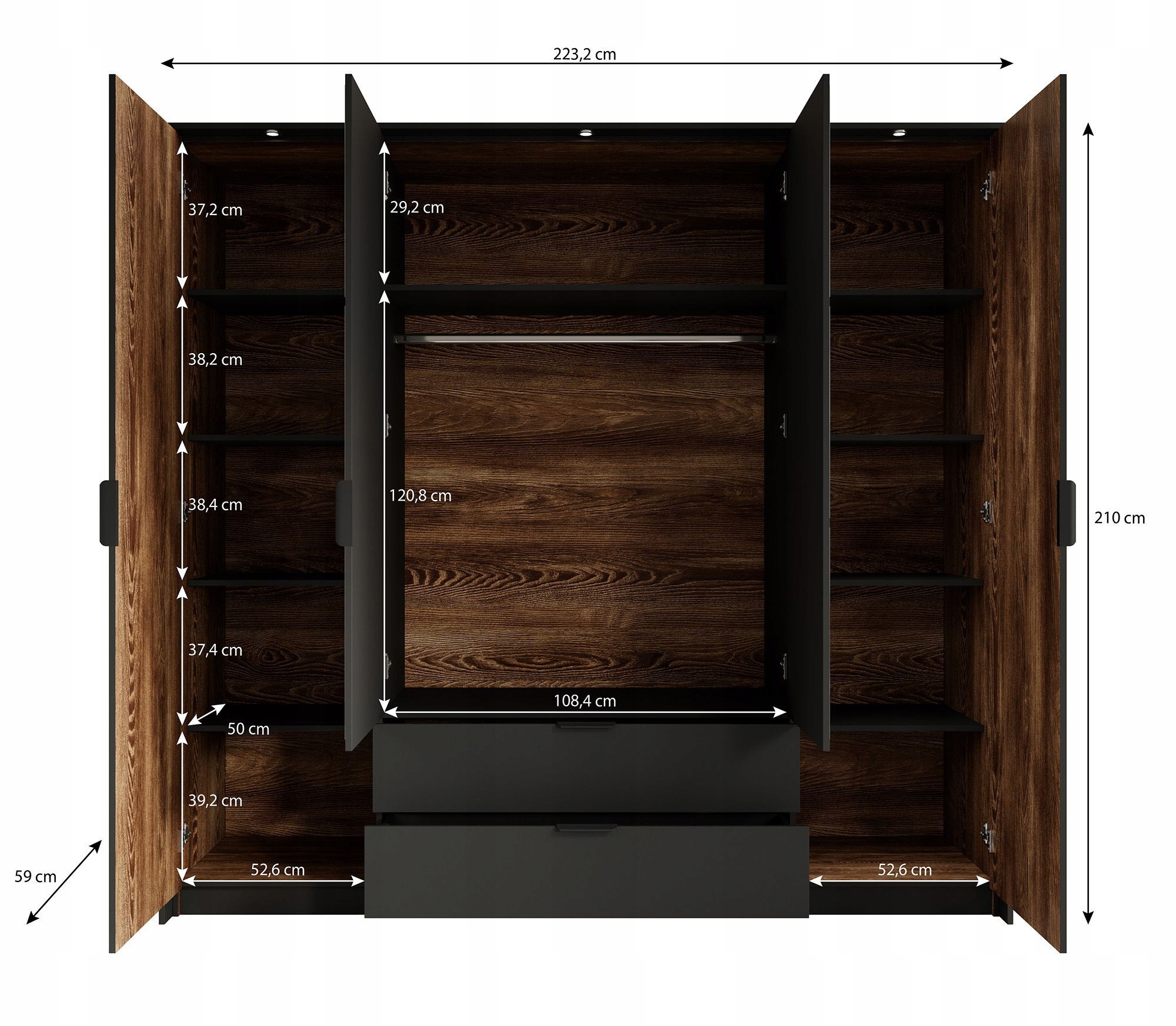 Шафа обладнана дзеркалами та практичними шухлядами. Лівий бік шафи містить виїмку з 4 полицями, в середині простору виїмку зі штангою для розвішування одягу, під виїмкою два містких ящика. Права частина шафи містить простору нішу, обладнану 4 полицями. Світлодіодне освітлення доступне на інших наших аукціонах