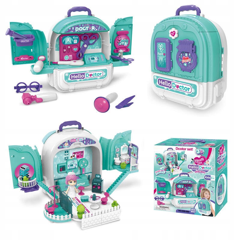 - Маленький лікар з аксесуарами, лікарня/будинок з ляльковою медсестрою в рюкзаку.