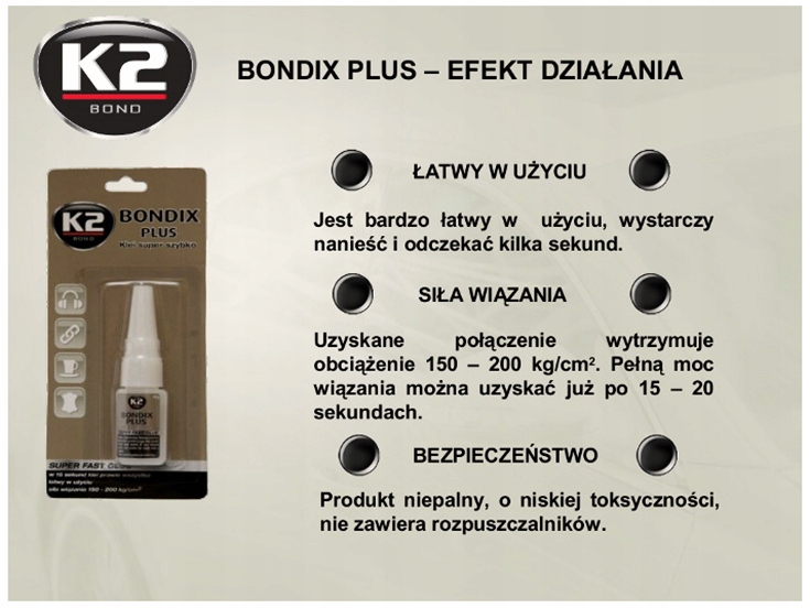 -це один -власний клей, який працює швидко, який з'єднує майже всі плавні поверхні, суворо відповідає один одному. Це не вимагає змішування або нагрівання. Bondix Plus не містить жодного розчинника, має низьку токсичність, помірний запах і не є розгромою.