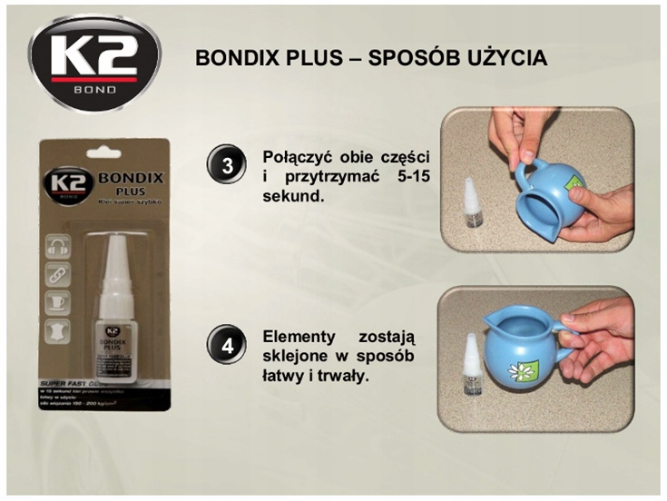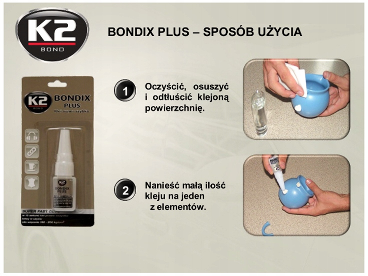 2. Нанесіть невелику кількість чудового клею Bondix плюс на одній із склеєних поверхонь, складіть їх із собою, щоб отримати рівний і тонкий шар клею. Потім сильно стисніть їх один з одним протягом 15 - 20 секунд. Чим тонше наноситься клейовий шар, тим сильніше буде отримано з'єднання.