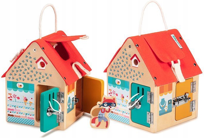 Відкрийте для себе захоплюючий маніпулятивний будинок "Лісек -грабіжник" від бельгійського бренду Lilliputiens! будь -яка стіна та дах будинку - це нові виклики для малюків - 6 різних кріплень і замків, таких як блискавка, липучка, ключ, оснащення, засувка та гак , пропонують захоплюючу забаву у відкритті, закритті та переміщенні. Кожна дверцята призводить до іншого магазину: велосипед, кондитерський виробник, ювелір та продуктовий продукт, що стимулює уяву дитини та підтримує розвиток координації ручної книги та невеликих моторних навичок. Дерев’яна фігурка Ліски прикріплена до іграшки, що спонукає малюка створювати історії та розмови про правила безпеки.