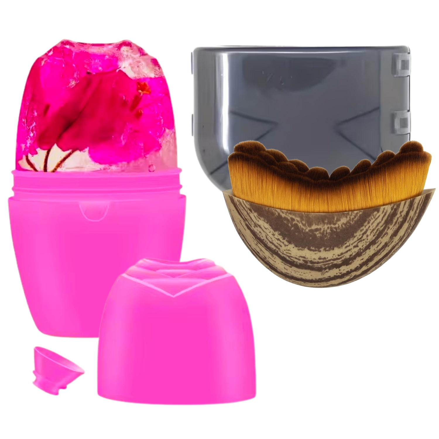 Щітка з ніжною щетиною елегантного коричнево-бежевого кольору підтримує мікроциркуляцію, допомагає зменшити набряк і готує шкіру до подальшого догляду. Рожевий Ice Massager забезпечує миттєве освіження, заспокоєння та зміцнення шкіри завдяки охолоджуючому масажу, який ви можете виконати всього за кілька хвилин секунд.