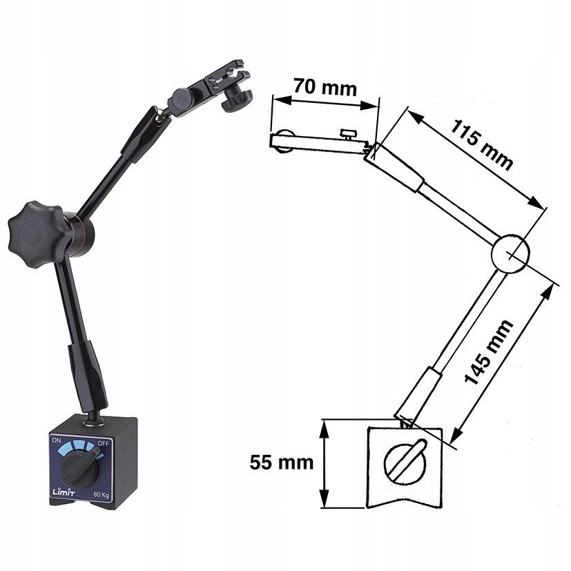 Діаметр кріпильного отвору: 8 мм Ширина магнітної основи: 50 мм Довжина магнітної основи: 55 мм Сила притягання магніту: 80кг Максимальна висота: 330 мм Вага нетто: 1,9 кг