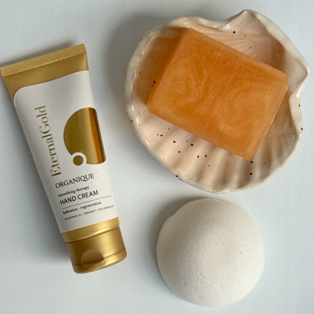 Крім керамічної черепашки, в набір входить цілих 3 косметичні засоби від бестселера Eternal Gold Smoothing Therapy: доглядаюче мило, бомбочка для ванни та крем для рук. Всю лінію вирізняє пудровий, ніжний та елегантний аромат, який залишається з вами надовго.