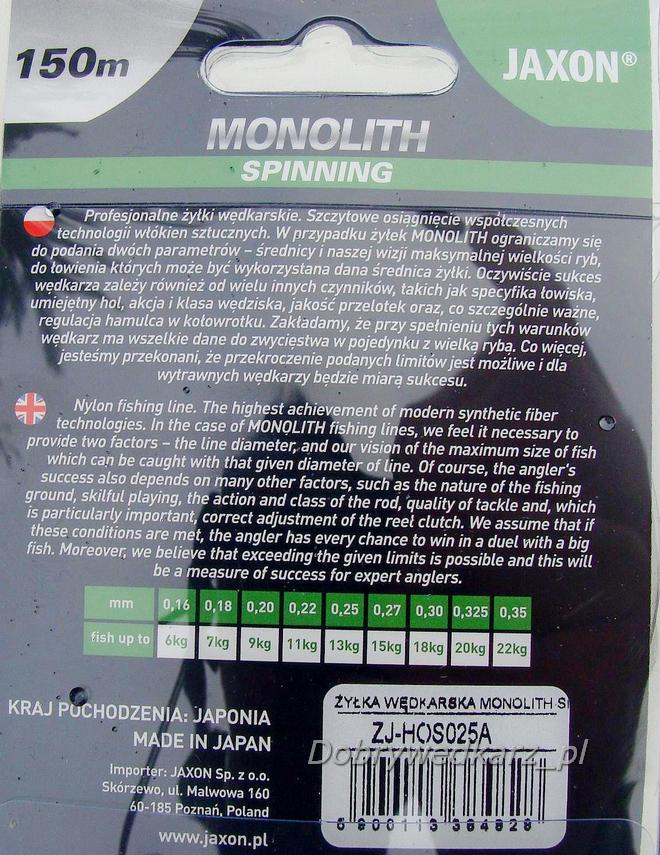 Jaxon Monolith Spinning — це волосінь для вимогливих рибалок на спінінг.Чудова міцність вузла, дуже хороше розташування під час закидання, відсутність пам’яті про деформацію.