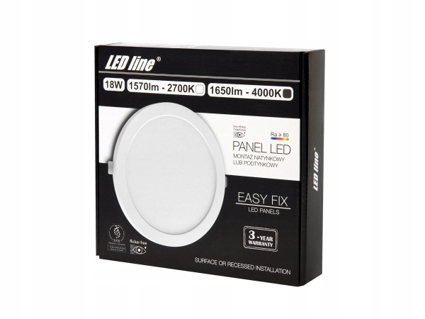 Панелі LED line® гарантують найвищі параметри освітлення: широкий кут променя 120°, чисте та приємне світло з високим індексом передачі кольору RA>80 – лише деякі з них. Дуже вузький корпус (13 мм) робить панель дуже естетичною на стелях. Кругла LED-панель line® EasyFix ідеально підійде як у вашому домі (вітальня, їдальня, спальня), так і в офісі, ресторані чи готелі.