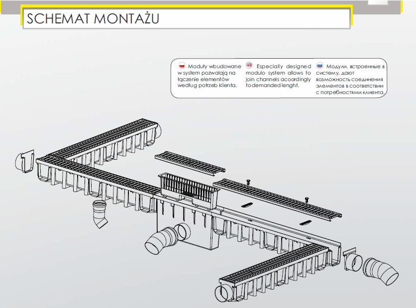 Лінійний водовідвід MAXPOL міцний, стійкий до механічних пошкоджень, простий в монтажі. Окремі елементи дозволяють універсально використовувати для відведення води з тротуарів, площ, доріг, гаражів, спортивних споруд тощо.