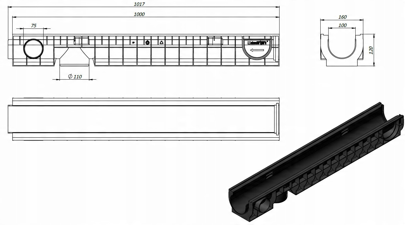Пластикові канали з чавунною решіткою для відведення (дренажу) води на внутрішніх дорогах, автостоянках, в саду, гаражі, на під'їздах до будинків і в усіх інших місцях, де є рух транспорту. Легка і міцна конструкція полегшує монтаж і транспортування. Можливість підключення нижнього зливу 110 або бокового зливу 75 без додаткових елементів.