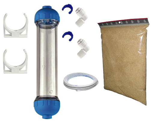 Фільтр складається з прозорого корпусу-лінійної коробки діаметром 2 дюйми, яка заповнена демінералізуючою смолою Purolite MB400 або її еквівалентом Rohm&Haas MB20. Смоляний фільтр можна прикріпити до акваріумної системи осмосу RO3 за допомогою двох затискачів 2"/2,5". Фільтр Demi також можна розібрати та заповнити будь-якою смолою.