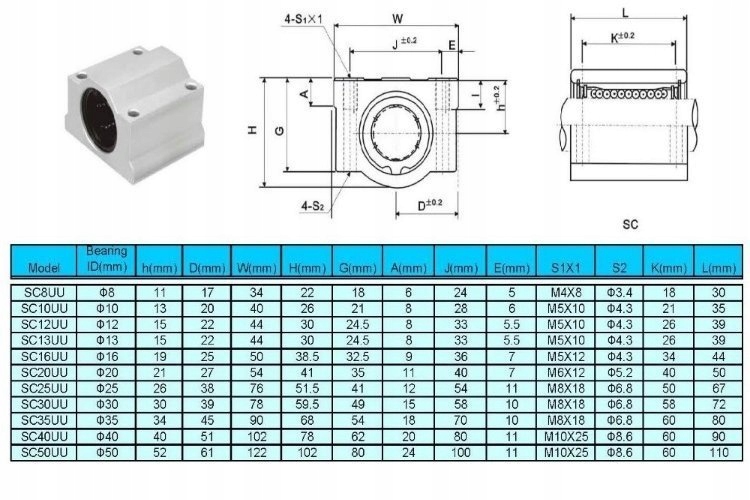 Лінійний підшипник LM12UU в корпусі SC12UU з діаметром отвору 12 мм. Закриті лінійні підшипники широко використовуються в техніці лінійного руху. Центральна частина підшипника виконана з пластику, а корпус з анодованих алюмінієвих сплавів.