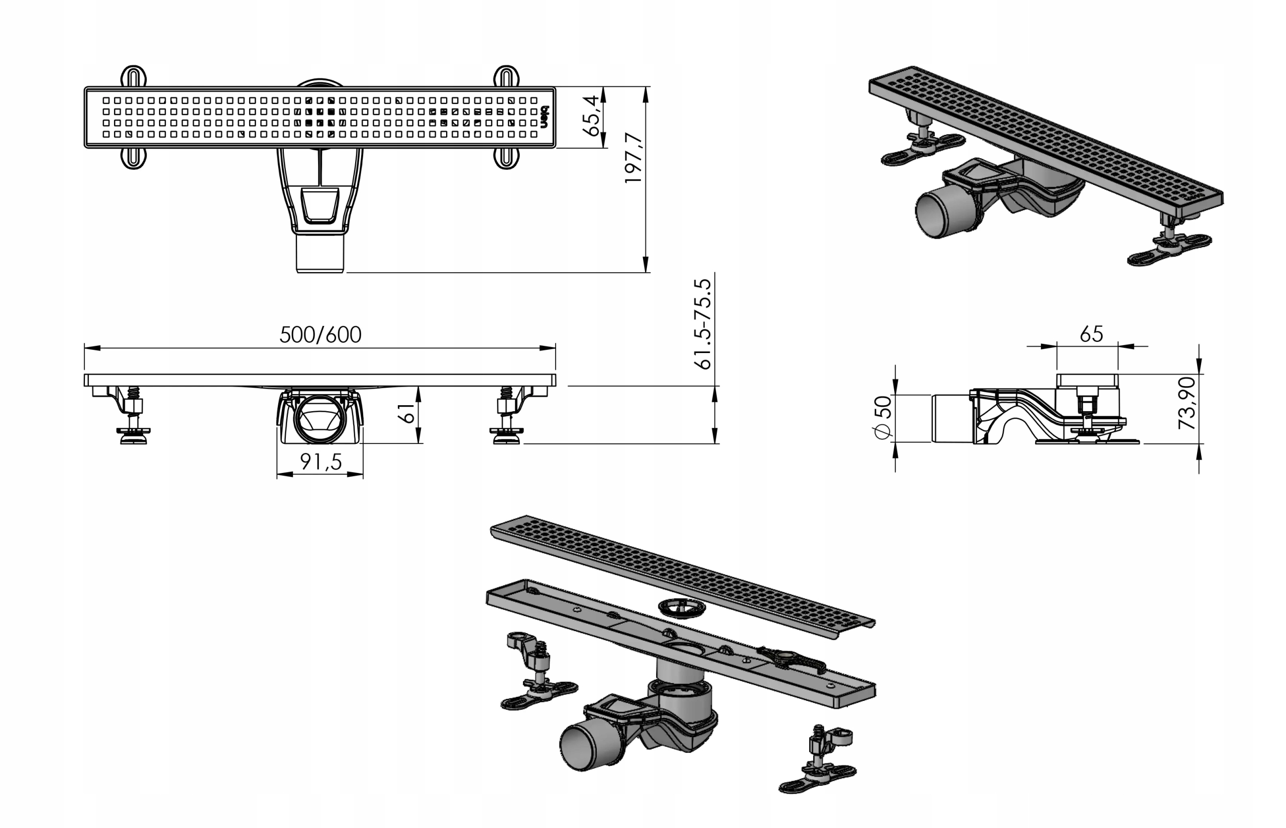 Можливість персоналізації та монтажу плитки Сталеву решітку можна легко зняти та замінити власною керамічною плиткою — всередині є спеціальні гачки, які утримують її на місці. Монтажний простір для плитки має висоту 8 мм, тому при використанні плитки товщиною 10 мм її поверхня буде виступати над рамою приблизно на 2 мм, створюючи тонкий, сучасний візуальний ефект. Виконання та застосування дренажу Лінійний злив має пропускну здатність до 61 л/хв, що значно перевищує стандартні ринкові показники (25-35 л/хв). Така висока пропускна здатність забезпечує безпроблемний злив води навіть під час інтенсивного використання. Це ідеальне рішення для сучасних душових кабін, ванних кімнат готелів і оздоровчих приміщень. Елементи набору: