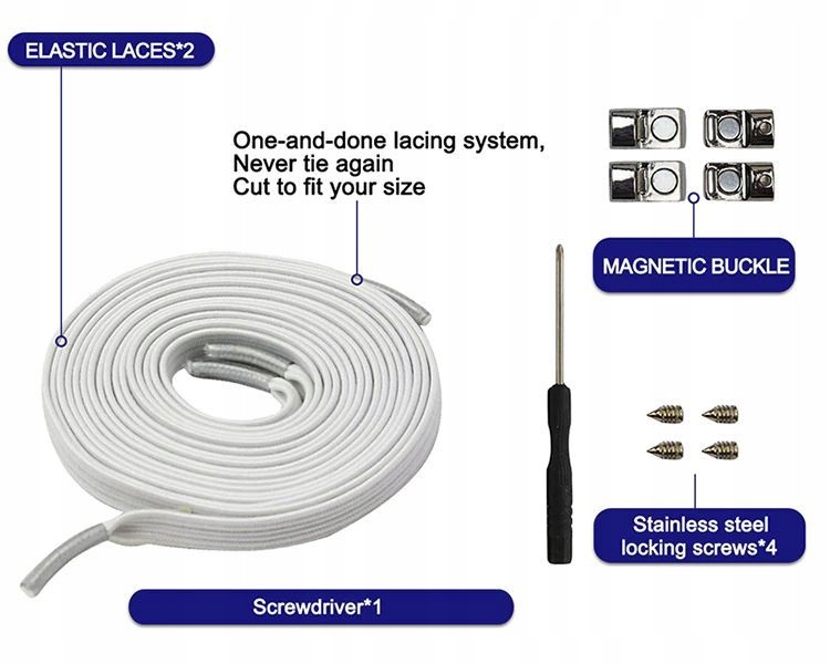 2 шнурка , 2 магнітні пряжки , набір шурупів і викрутка.