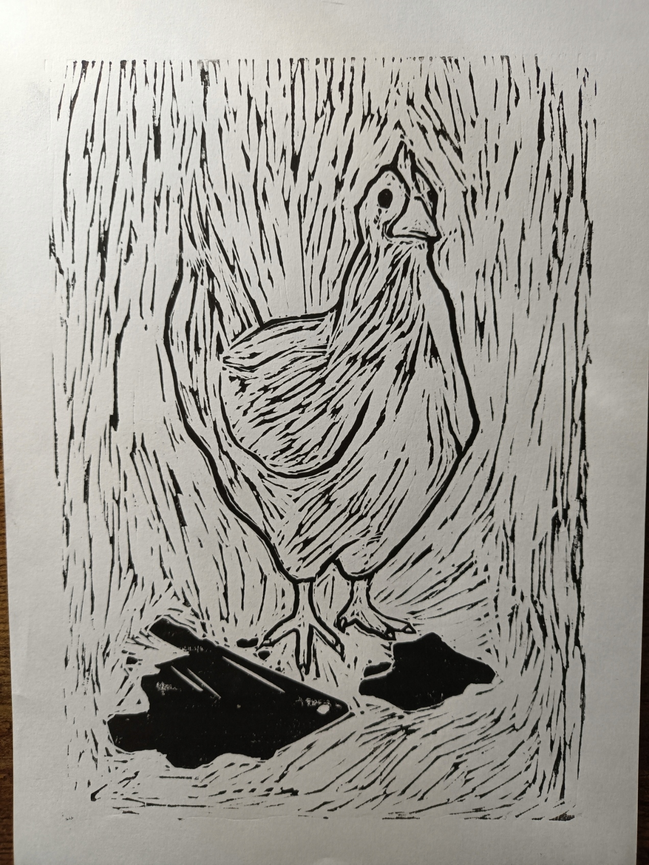 Оригінальна ліногравюра із зображенням курки в природному, сільському оточенні. Графіка виконана в техніці рельєфного друку, де візерунок вручну вирізається на лінолеумі, а потім фарбою друкується на папері. Кожен виріб унікальний і може відрізнятися дрібними деталями - це природна особливість рукоділля.