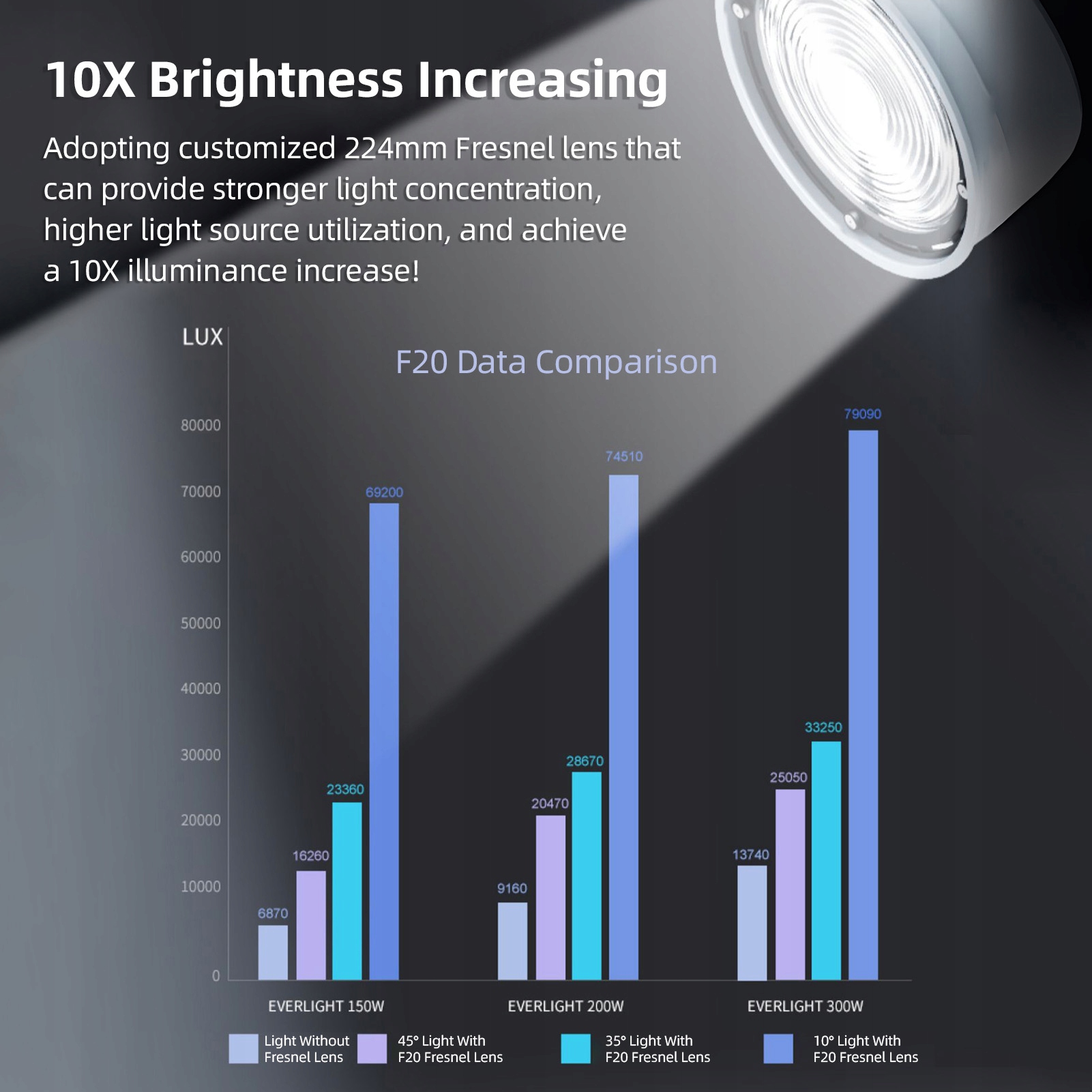 2. 10-кратне підвищення яскравості: використання індивідуальної лінзи Френеля 224 мм, яка може забезпечити сильнішу концентрацію світла, краще використання джерела світла та досягти 10-кратного збільшення освітлення!