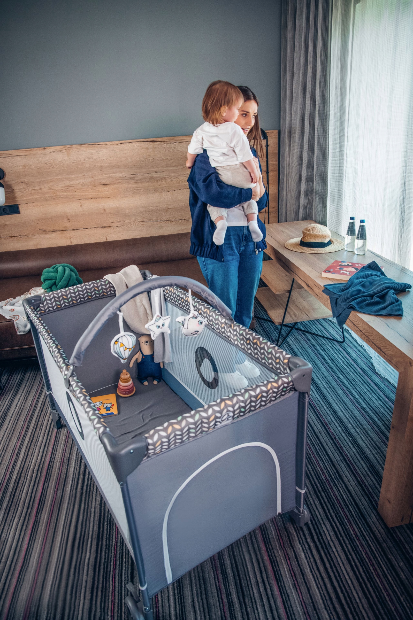 ✔ Повітряна сітка на довгих сторонах забезпечує достатню циркуляцію повітря та огляд дитини.
