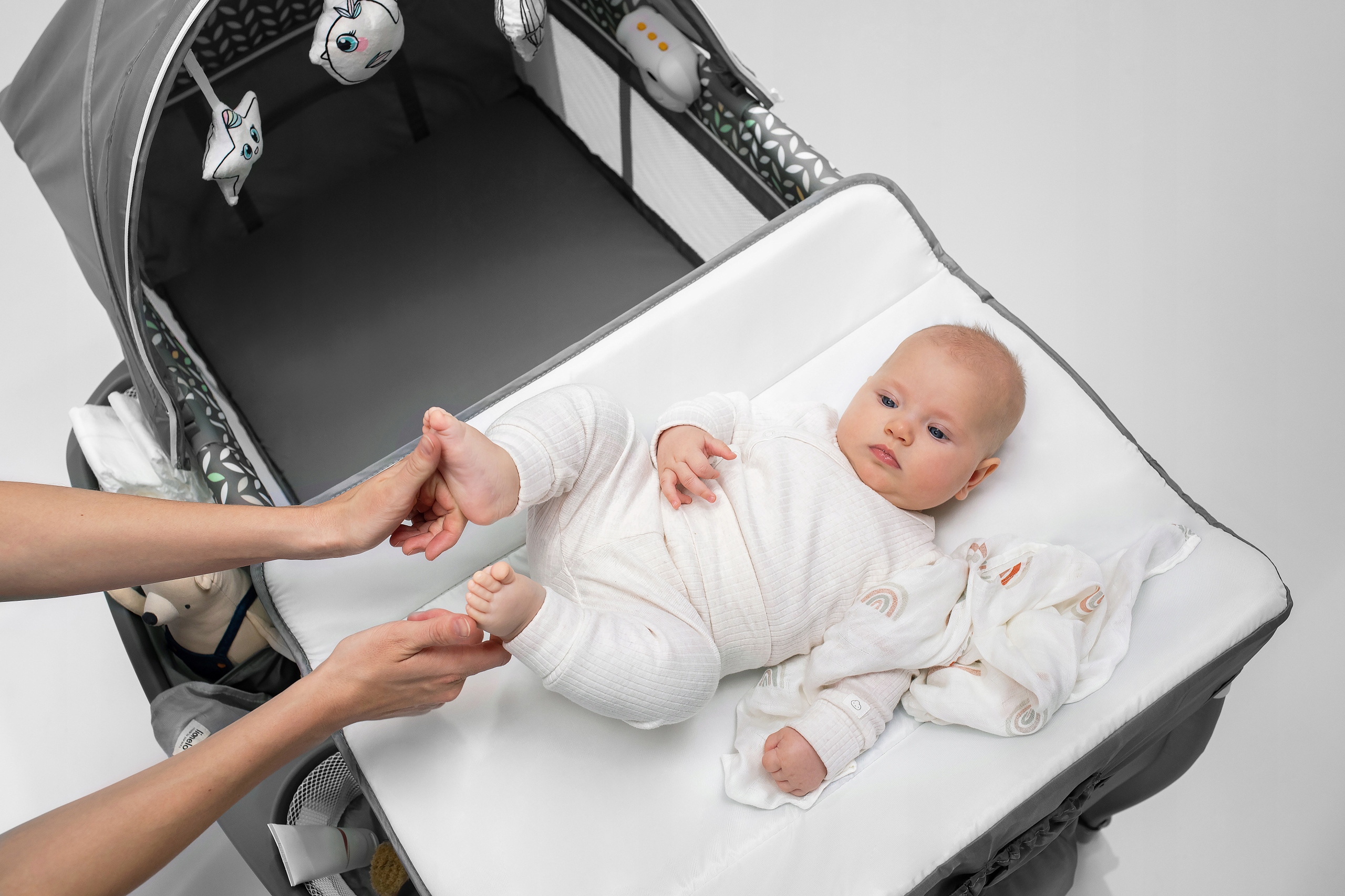 ✔ Безпечний сповивальний столик із м’якою підкладкою та двома функціональними кишенями.