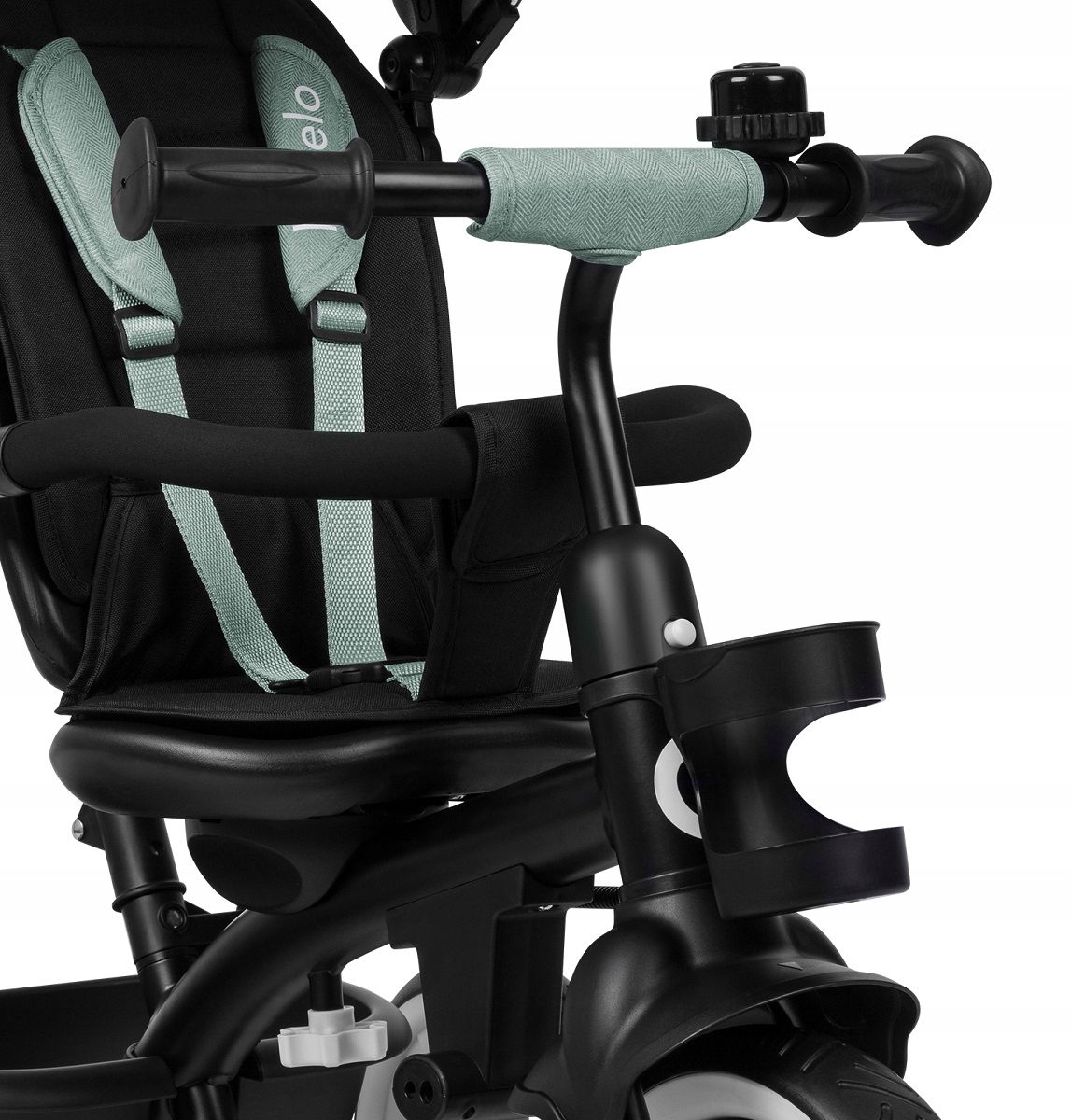 Покриття на передньому ободі, 3-бальні ремені з накладками та бар'єр навколо сидіння забезпечують безпеку під час руху. Власник чашок, саше для дрібних предметів та дзвону.
