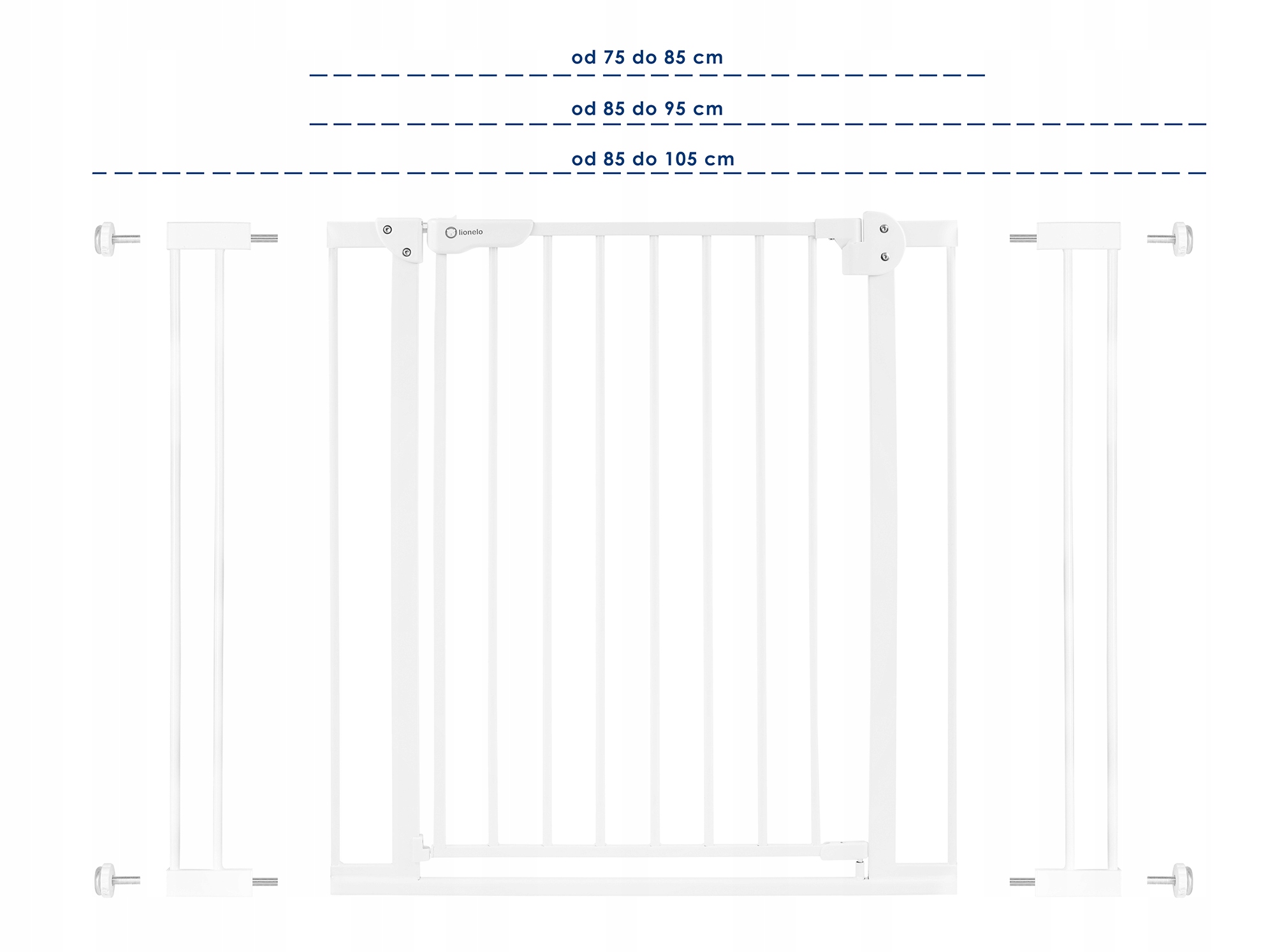 Універсальні розміри - широкийдіапазон від 75 до 85 см підходить для більшості стандартні дверні рами. Спеціальна накладка дозволяє подовжити шлагбаум до 105 см. Після додавання додаткового розширення ворота також можна використовувати для захисту сходів.