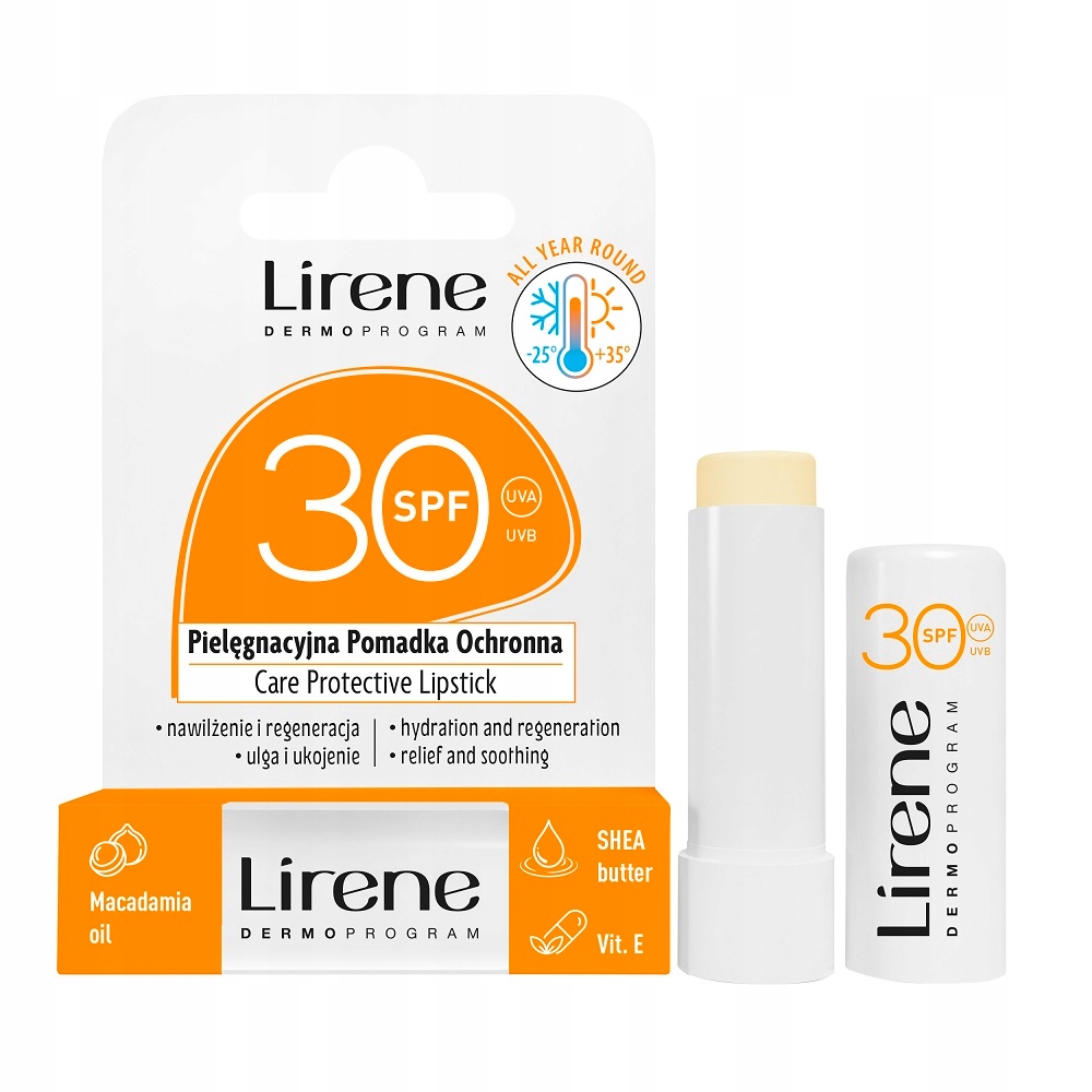 Захисна помада Lirene діє на багатьох рівнях: вона інтенсивно відновлює, живить, довготривало зволожує та пом’якшує губи, а також захищає їх від факторів навколишнього середовища, включаючи ультрафіолетове випромінювання. Своєю активною дією він зобов'язаний ряду пом'якшувальних речовин, серед яких: масло макадамії, масла ши і бджолиного воску, антиоксидант вітамін Е і, звичайно, сонцезахисний крем.