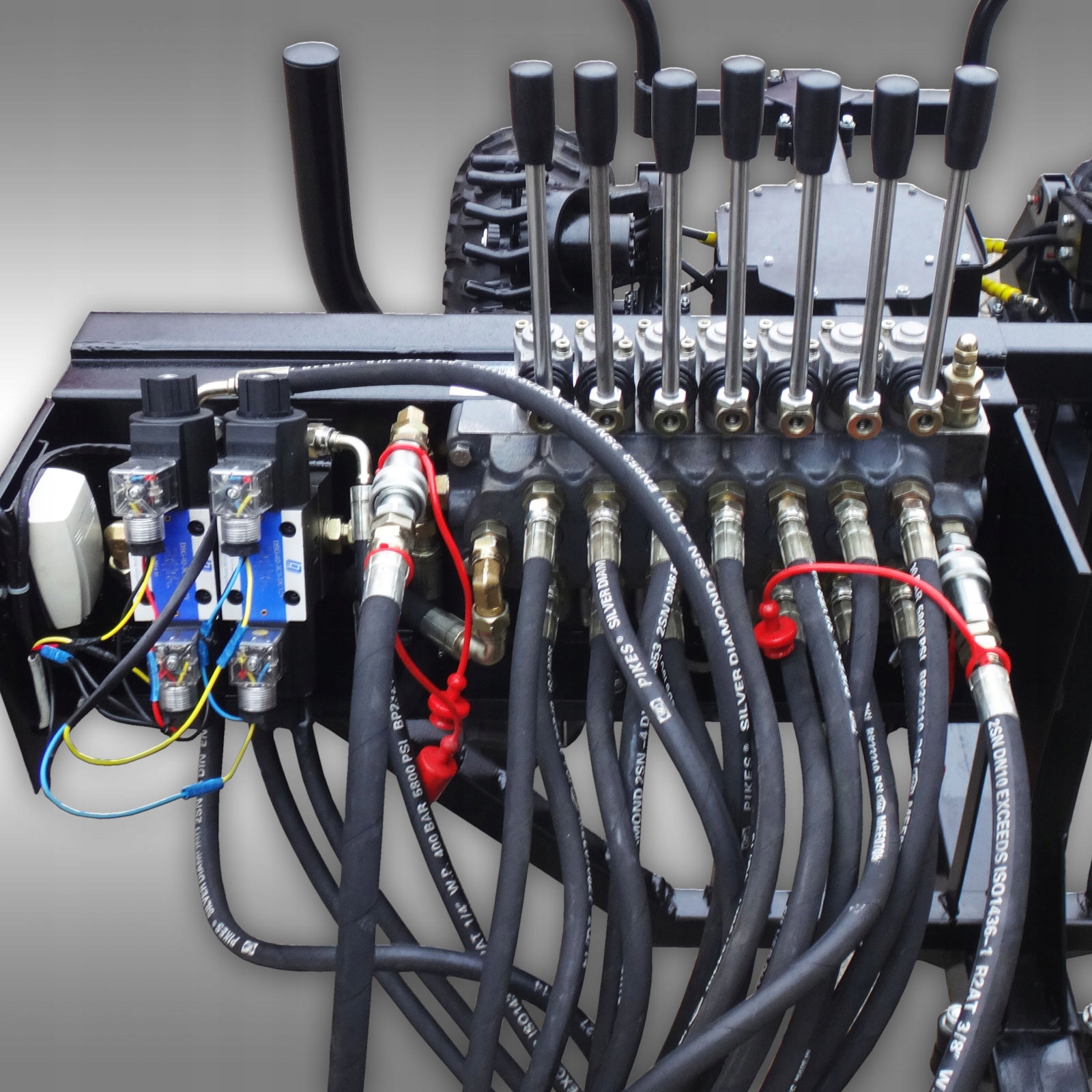 Причіп оснащений гідравлічним приводом на повне колесом, який можна включати та вимкнути, щоб ви могли легко переміщувати його навіть у дуже нерівній місцевості. Весь привід колеса можна включити електрично за допомогою магнітного клапана. Він також має гідравлічні опори. Підставки можуть бути гідравлічно контрольовані індивідуально.