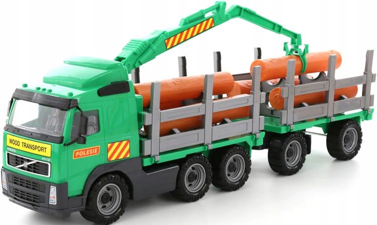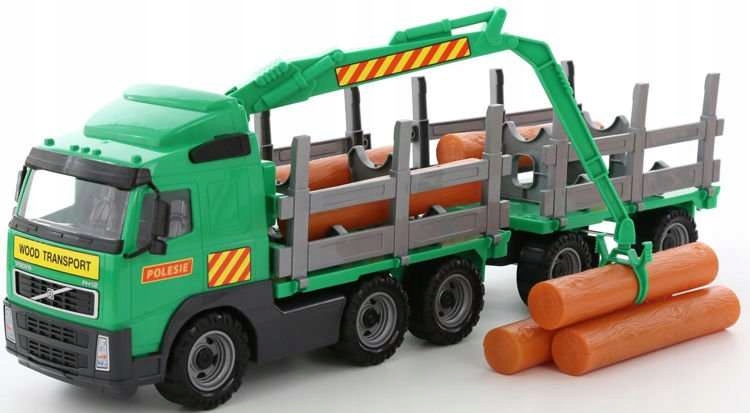 Лесовоз VOLVO з причепом – це велика вантажівка, обладнана з широкими колесами, з’єднаними металевими осями. Їх структура не гладка, що полегшує їзду по нерівній поверхні. У причепі є місце для транспортування дров, які входять в комплект. На транспортному засобі є спеціальний, пересувний кран з грейфером, який дозволяє транспортувати колоди з автомобіля та до нього. У комплект входить додатковий причіп з колодами. Кабіна водія скляна. Для цього використовувався щільний прозорий пластик.