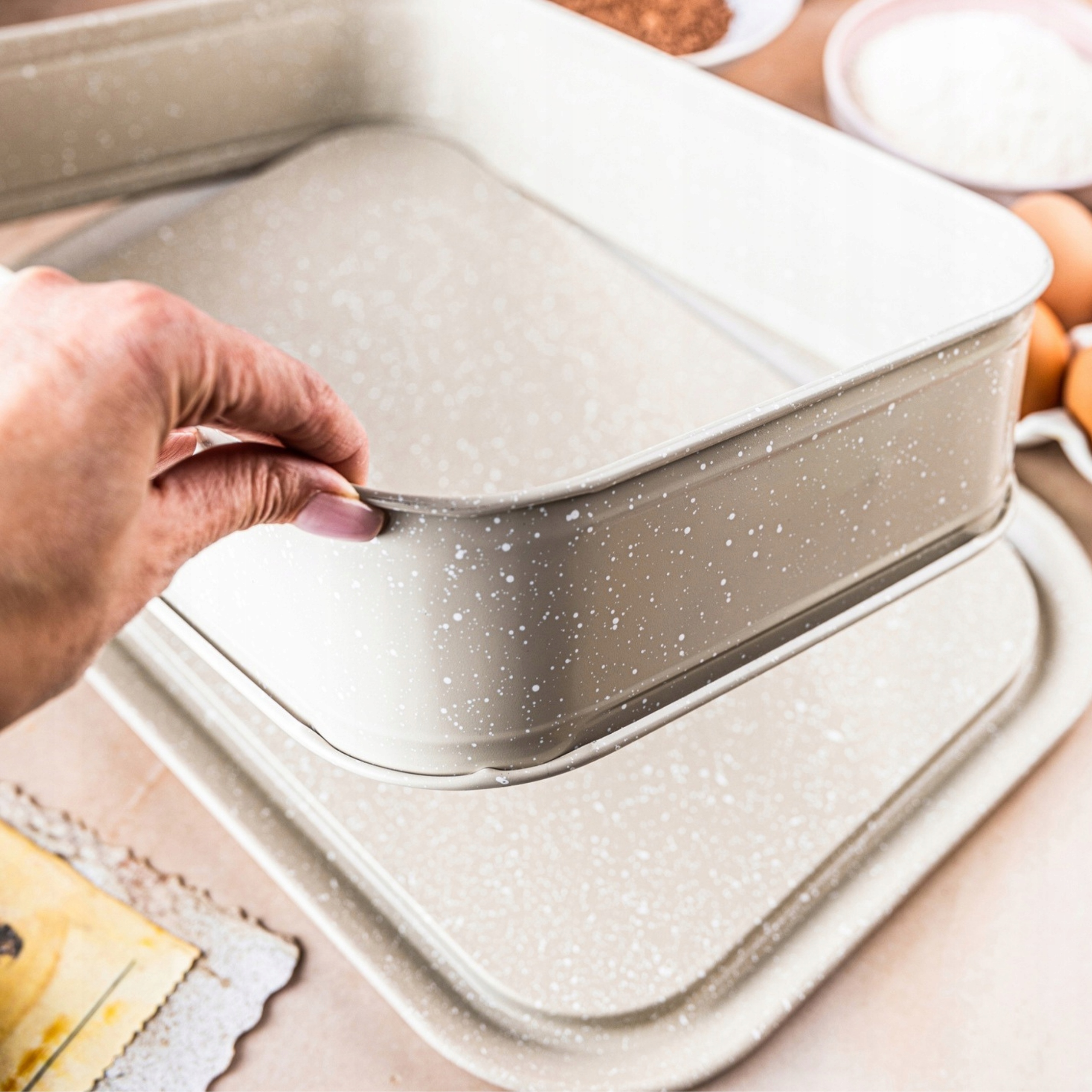 ➡️Внутрішня частина покрита мармуровим антипригарним покриттям, яке запобігає прилипанню та дозволяє випікати без паперу та зайвого жиру.