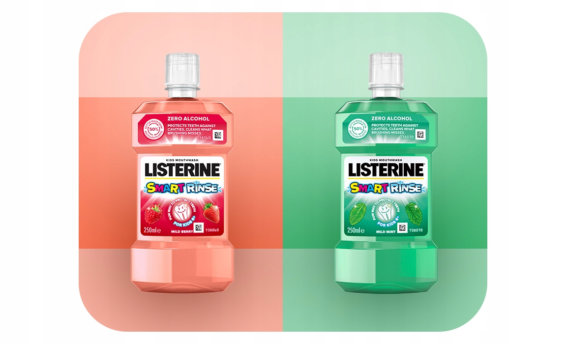Listerine® Smart Rinse для дітей, доступний у двох смаках: м’ята та фрукти
