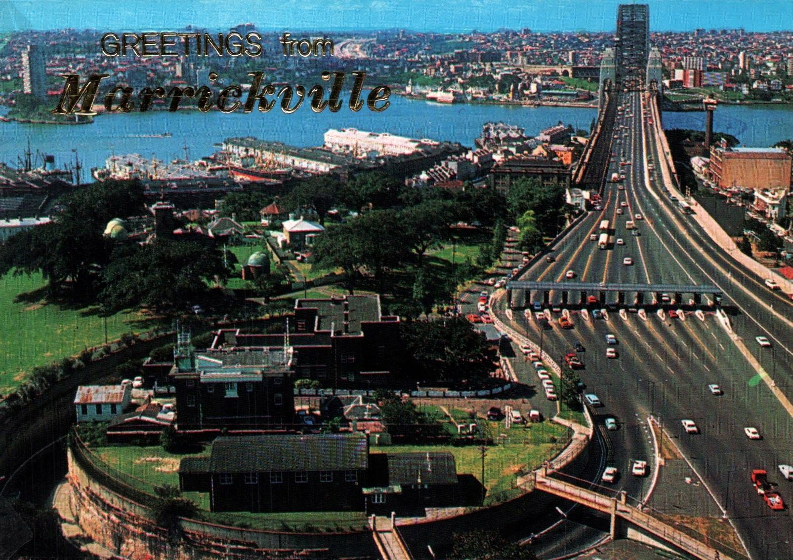 На цій листівці зображено вид на міст Cahill Expressway та околиці Маріквілля, Австралія. У кадрі переважають широкі смуги шосе та мостової конструкції, що проходять над водою. На задньому плані можна побачити міський пейзаж із забудовами та бухтою, а на передньому плані – фрагмент території із забудовами та зеленими насадженнями. Загалом Марриквіль представляє собою міський район із розвиненою дорожньою інфраструктурою та доступом до водних просторів.
