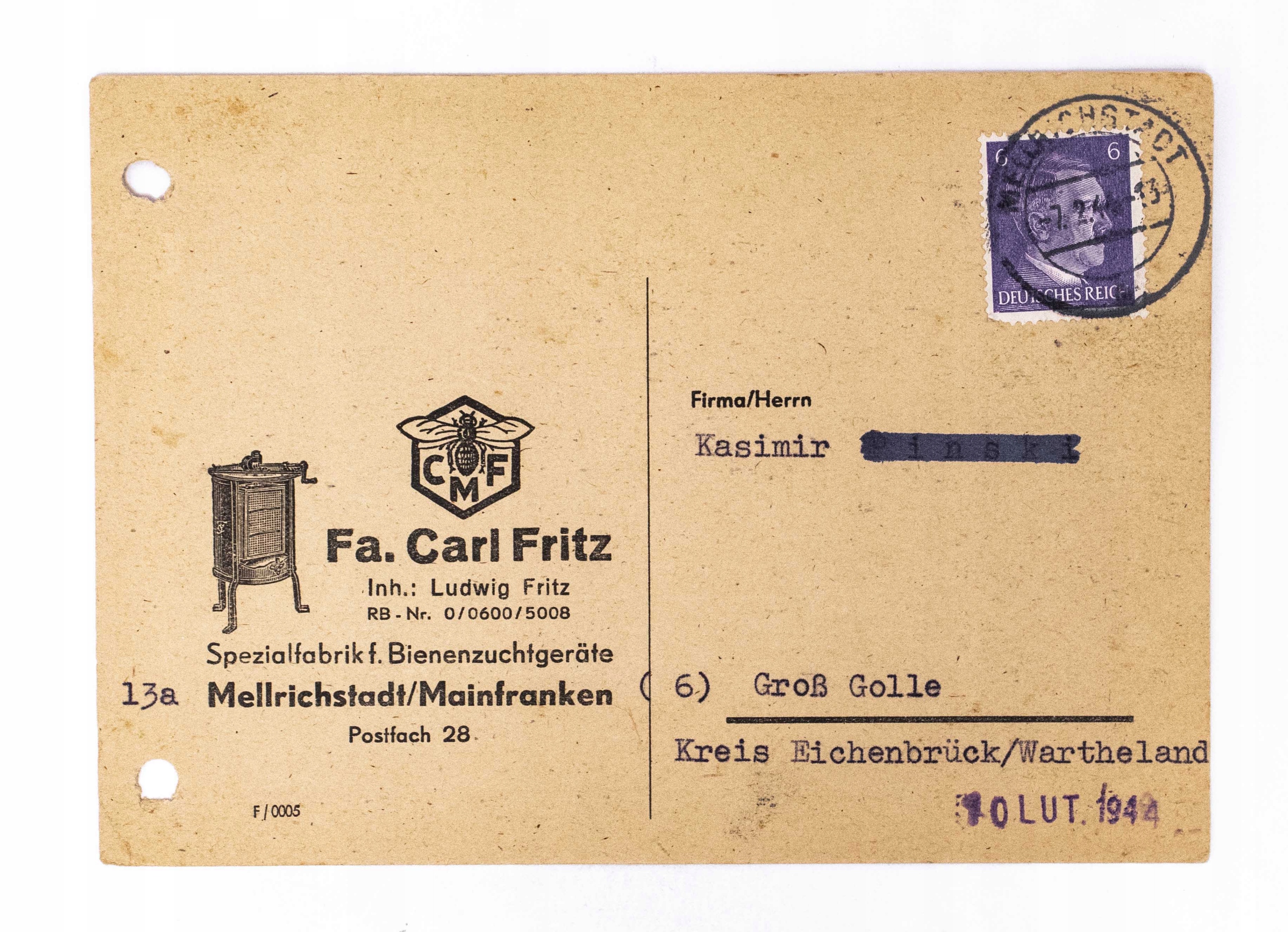 СТАРА ЛИСТІВКА - ПАСІЧНА КОМПАНІЯ FA. CARL FRITZ, GOŁASZEWO / WĄGROWIEC 1944