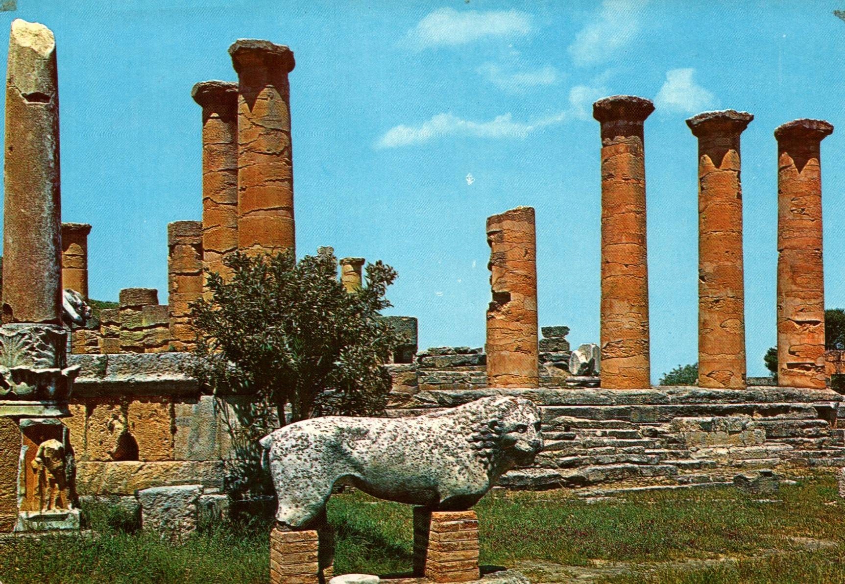 На цій незвичайній листівці зображені руїни стародавнього міста Кірена (Кірена), одного з найважливіших центрів грецької колонізації в Північній Африці. На передньому плані ми бачимо фрагменти колонад, кам'яні скульптури та монументального лева - типовий мотив античної цивілізації. Теплі кольори пісковика та блакитне небо створюють мальовничий контраст, відображаючи атмосферу Лівії 1970-1980-х років.