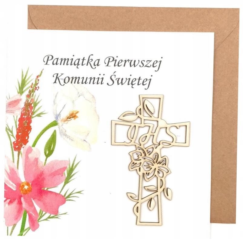 Вітальна листівка з нагоди Першого Святого Причастя з таким текстом: В урочистий день Першого Святого Причастя бажаємо Вам рясних Божих ласк, а Таїнство Євхаристії нехай зміцнює Ваші віра, надія і любов.