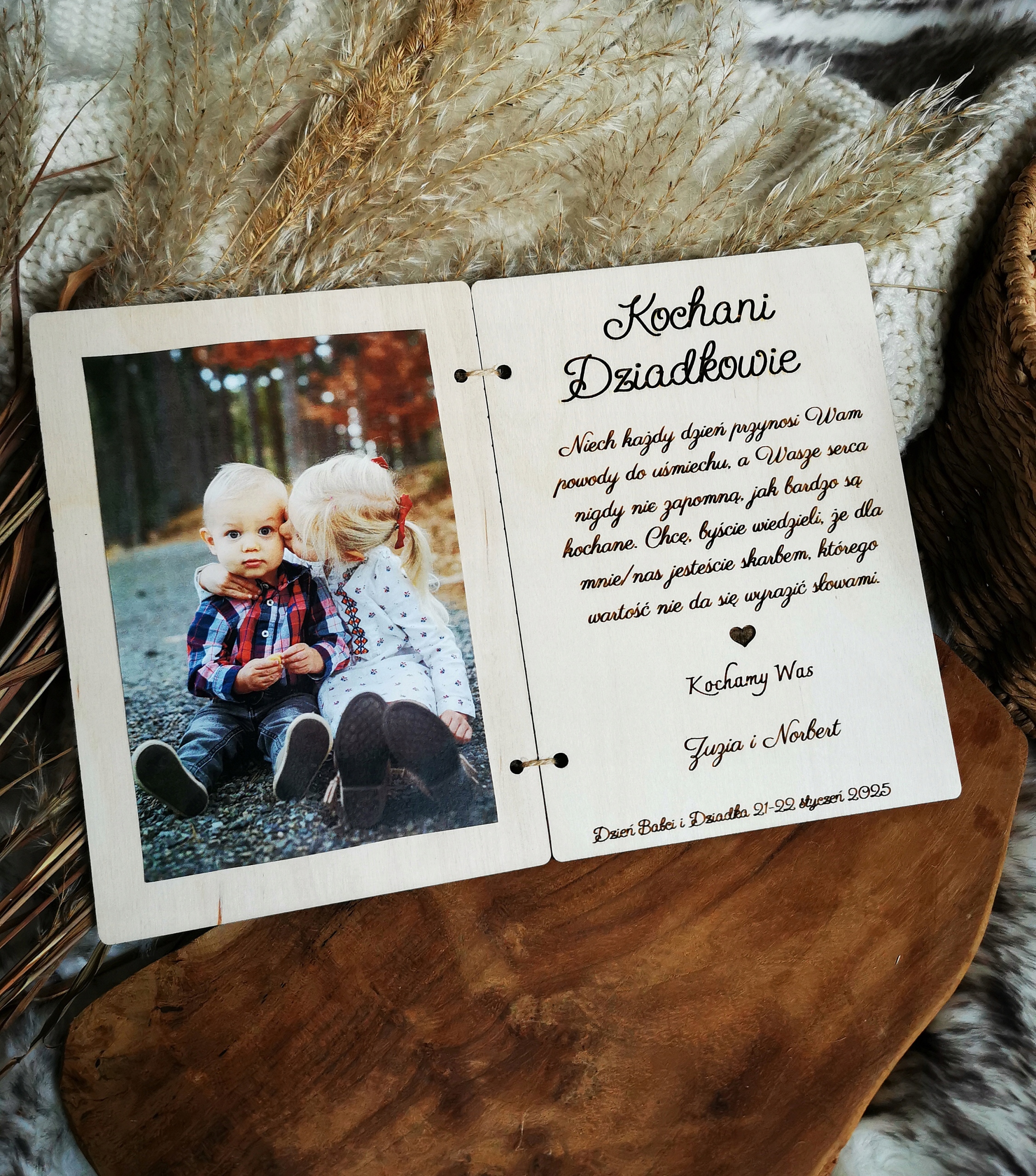 Листівка до Дня бабусі та дідуся, дерев'яна листівка побажань з фотографією Персо