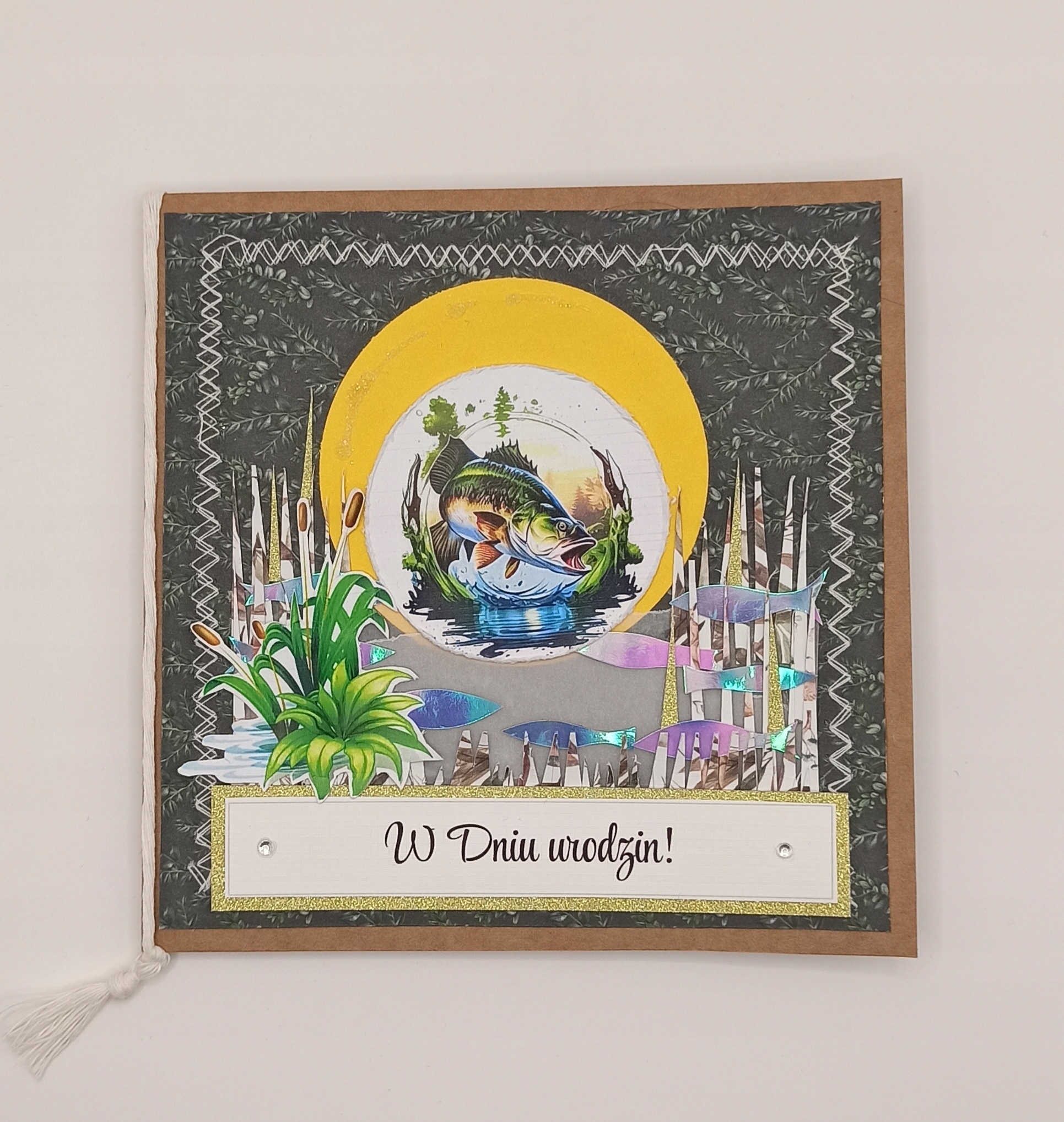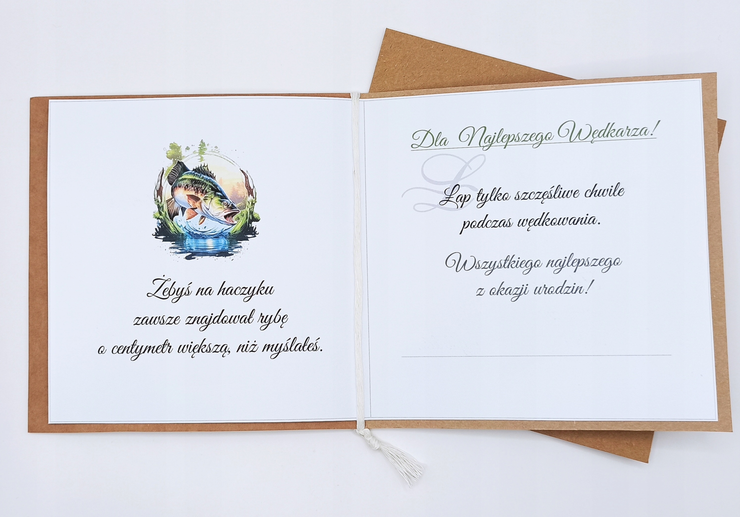 листівка на день народження для справжнього риболовлі у форматі 14,5 х 14,5 см із вставленими побажаннями та конвертом.