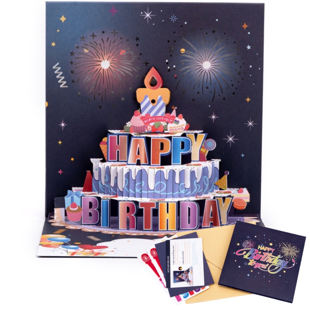 Ця тривимірна листівка на день народження має гучний звук «З днем народження» та барвисті світлові ефекти, ідеальне поєднання аудіотехнологій та технологій освітлення. На відміну від нудної листівки з днем народження!