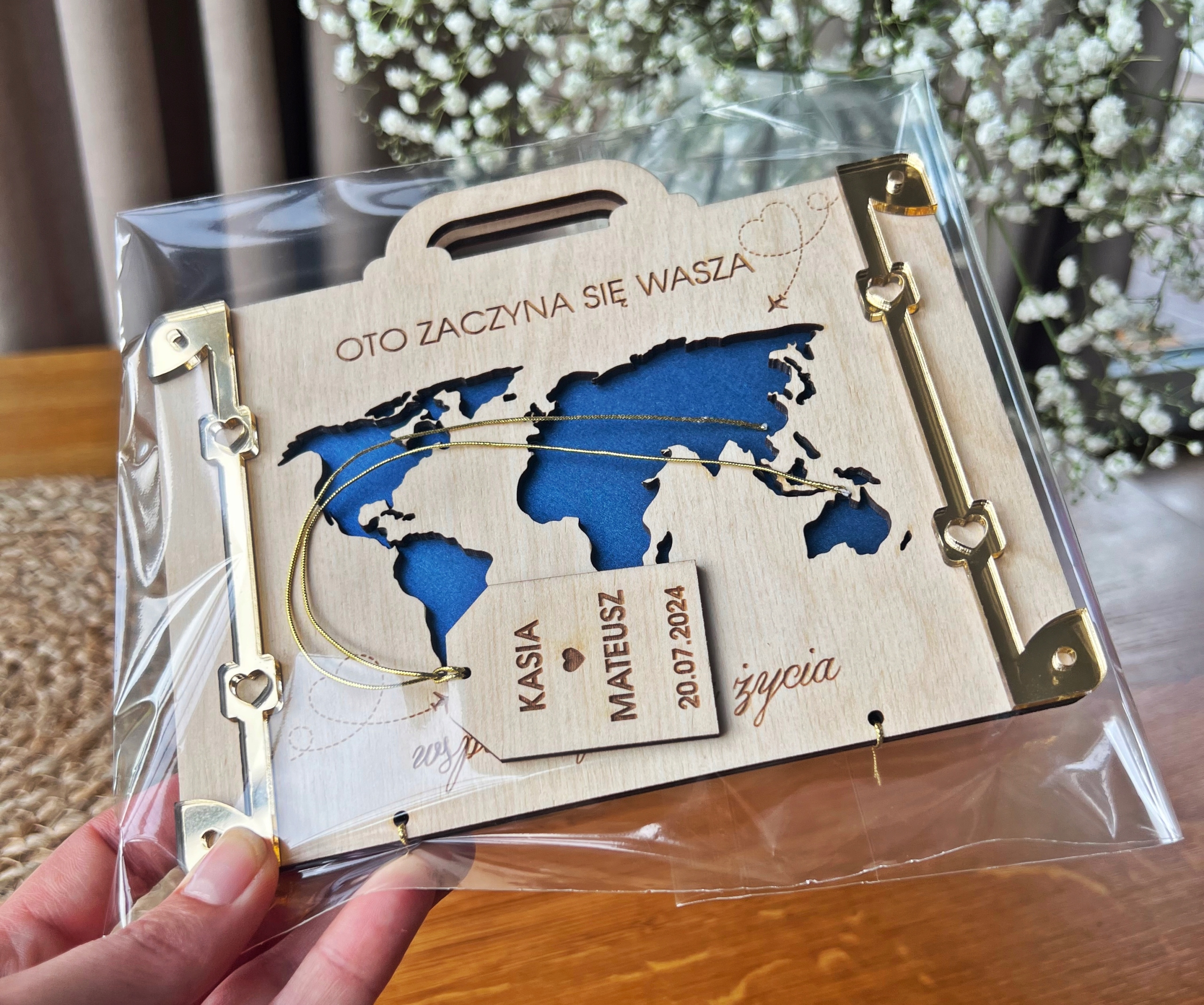 На лицьовій стороні картки є вирізана карта світу (колір карти відповідає кольору вибраного конверта) та декоровані золоті елементи. На горловині прикріплений конверт (8 кольорів на вибір), перев'язаний дерев'яною запискою з іменами нареченої та датою весілля. >