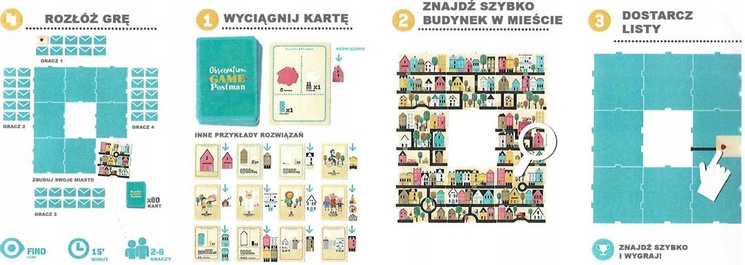 - 80 карток з інструкціями щодо доставки листів, 40 листів (у 4 блістерах по 10 шт.), 6 пазлів для складання міста