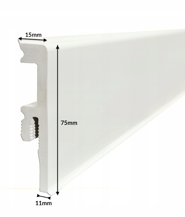 - Полосу відрізняє висока стійкість до пошкоджень, водостійкість і сучасна форма. Оптимальна висота 75 мм і використання гнучких гумок по краях планки роблять її практичним і естетичним елементом обробки інтер'єру.
