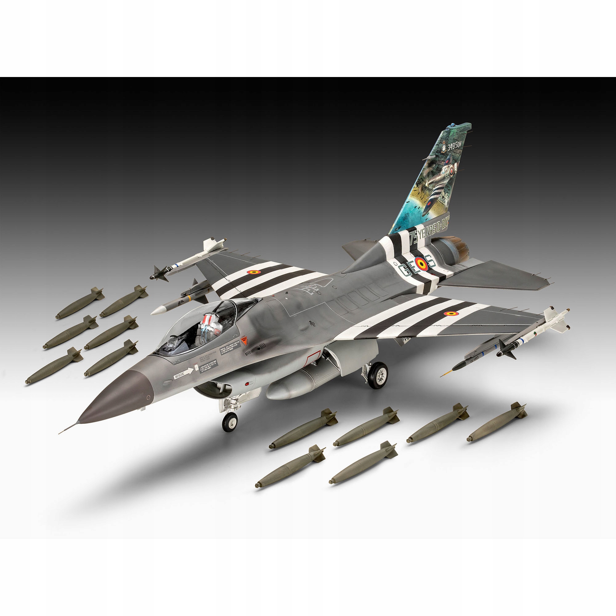 набір, випущений з нагоди 50-ї річниці легенди про F-16 Falcon Sky. F-16 здійснив свій перший рейс 20 січня 1974 року. Протягом багатьох років літак постійно розвивався і досі є одним із найсучасніших бійців у ВПС США. Його розвиток не припинився, і працює над наступними вдосконаленнями! Модель 1:32 містить детальні текстури поверхні, детальні сидіння та шасі, які можна зробити у відкритому та закритому положенні. Під крилами існують пілони, на яких можна призупинити озброєння (оболонки та снаряди горобців). Наклейка дозволяє робити модель у версіях: 50 років F-16, F-16A Belgian Air Force 75. Annivery Day, 349 SQN FA-124, 2019. Пластикова модель для приклеювання Revell (Rev-03802) та клею.