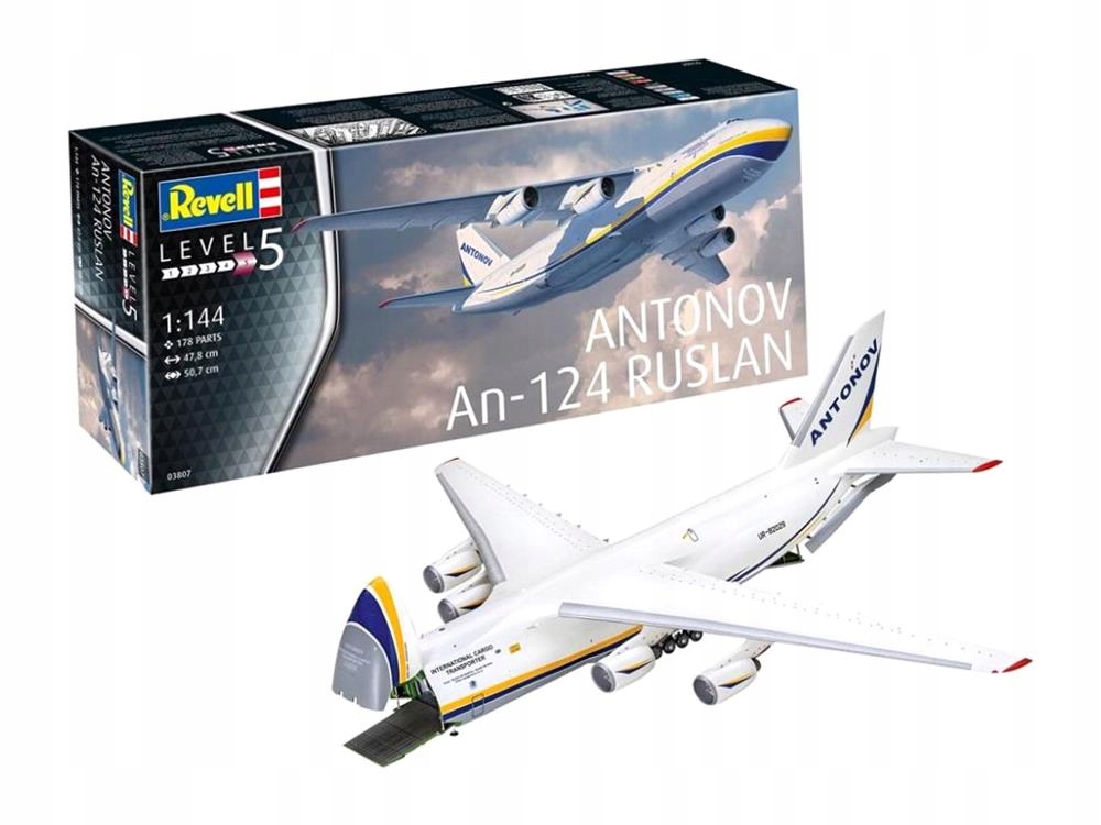 Легенда повітряного транспорту величезний літак Антонов Ан-124 "Руслан". «Руслан» — найбільший серійний літак у світі. З моменту свого першого польоту 26 грудня 1982 року Ан-124 встановив низку нових рекордів корисного навантаження, досягнувши максимальної злітної маси 405 тонн і корисного навантаження 150 тонн. Серед відомих конструктивних особливостей — носова частина, що відкидається вгору, і великі завантажувальні двері в хвості, які дозволяють одночасно завантажувати й розвантажувати. Набір у масштабі 1:144 включає: - Деталізовані поверхневі текстури з видимими розділовими лініями, - Інтер'єр вантажного відділення з кранами - 24 колеса шасі, - Деталізовані двигуни, - Декаль: Антонов АН-124 Руслан, Міжнародний вантажний транспортер, 2023, Рекомендовано кольори фарб: 32104, 32109, 32115, 32130, 32147, 32150, 32176, 32183, 32184, 32188, 32190, 32191, 32199, 32302, 32330, 32360, 32731, 2752. Набір пластикових моделей Revell (REV-03807) не має в комплекті з фарбами та клеєм.