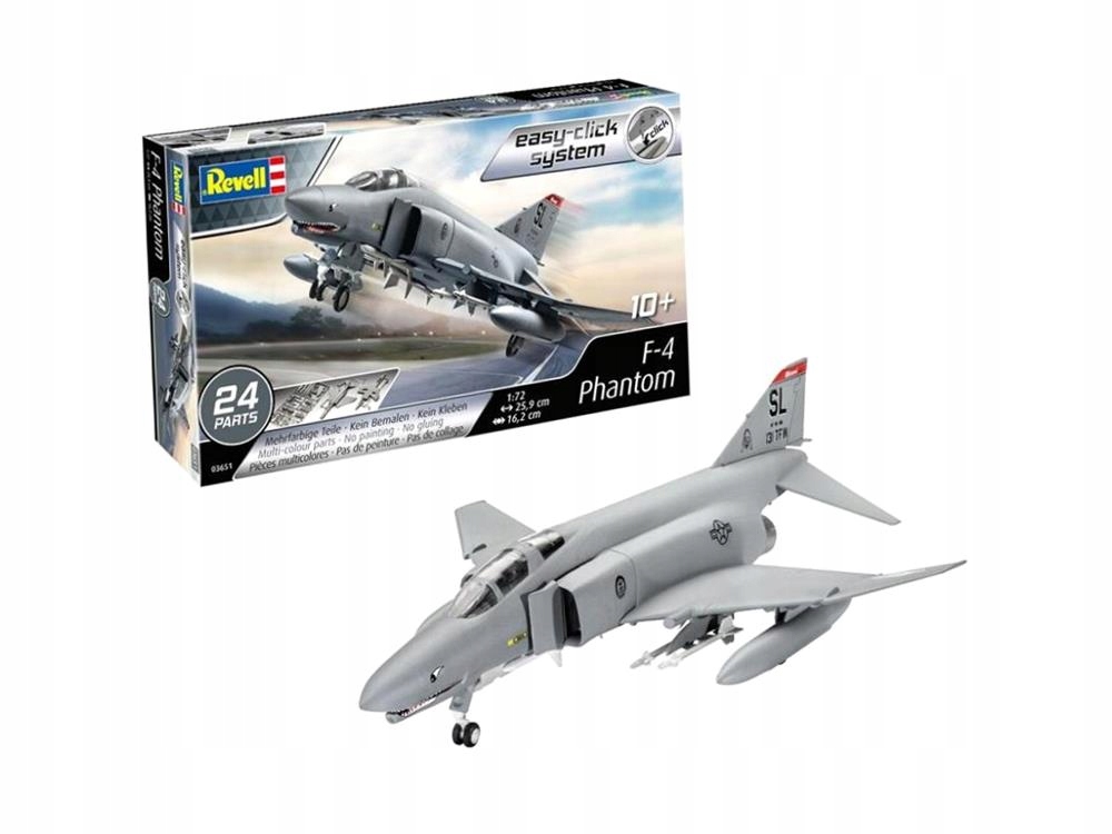 F-4E Phantom - двомісний надзвуковий винищувач-бомбардувальник. У моделі використовується інноваційна система Easy-Click-System, не вимагає використання клею при складанні моделі. Рекомендовані кольори фарби: 32105, 32109, 32139, 32176, 32191. Розкладна пластикова модель Revell (REV-03651) не містить фарб. Специфікація Каталожний номер: REV-03651 Виробник: Revell Розміри: 311x183x46 Довжина: 259 мм Розмах крил: 162 мм Висота: 62 мм Масштаб: 1:72 Кількість елементів: 24 Інструкція: так Вікова група: 10+