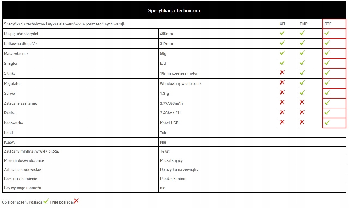 Літак у версії RTF, модель містить усі елементи, необхідні для польоту, такі як двигун, контролер , сервоприводи, акумулятор, зарядний пристрій, передавач і приймач. Щоб самостійно живити передавач, вам потрібно буде придбати 4 палички AA.