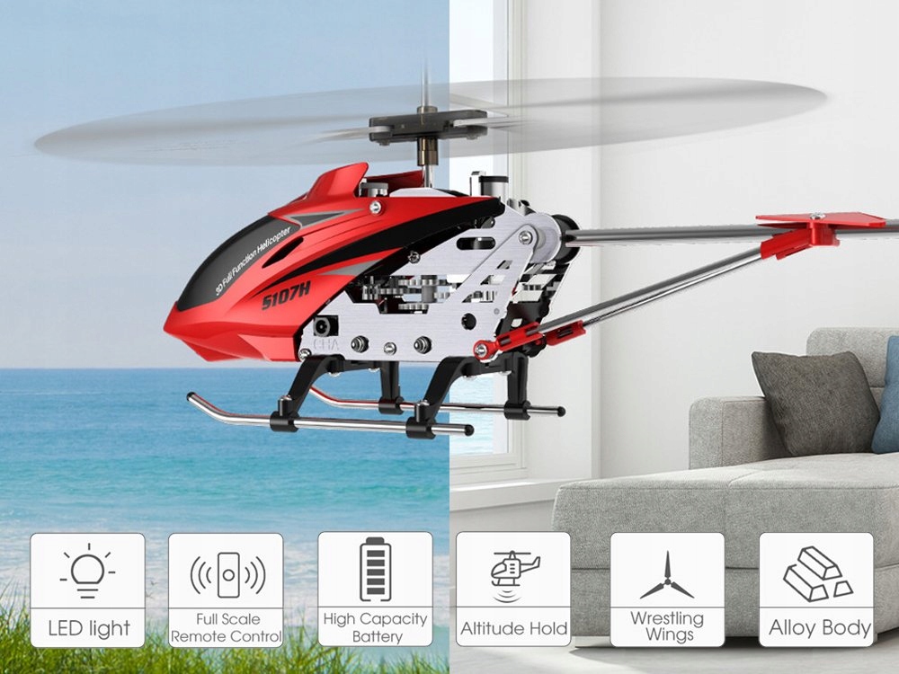 Вертоліт Syma S107H з металевим корпусом - це пропозиція для кожного молодого пілота, обладнання ідеальне для навчання. Гелікоптер має приховану електроніку в кабіні та підвищену міцність і стійкість до несподіваних ударів; він повністю виготовлений з алюмінію. S0107H — найкраща модель на дистанційному керуванні з покращеною системою стабілізації ГІРоскопа, щоразу, коли модель вмикається та кладеться на землю, система зчитує налаштування та забезпечує стабільність моделі під час набору висоти та самого польоту. Це означає, що зовсім недосвідчений пілот не матиме проблем під час перших польотів цієї машини. Завдяки невеликим розмірам і дуже точному управлінню з системою стабілізації GYRO він ідеально підходить для гри вдома. 3,5-канальна траєкторія польоту дозволяє рухатися в будь-якому напрямку, навіть по діагоналі. Системи стабілізації польоту, коаксіальні ротори, що обертаються протилежно, і вертикально розміщений задній ротор роблять політ справді легким.