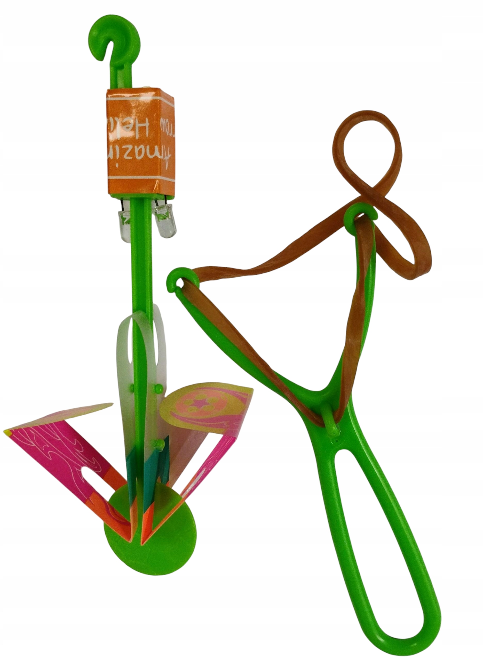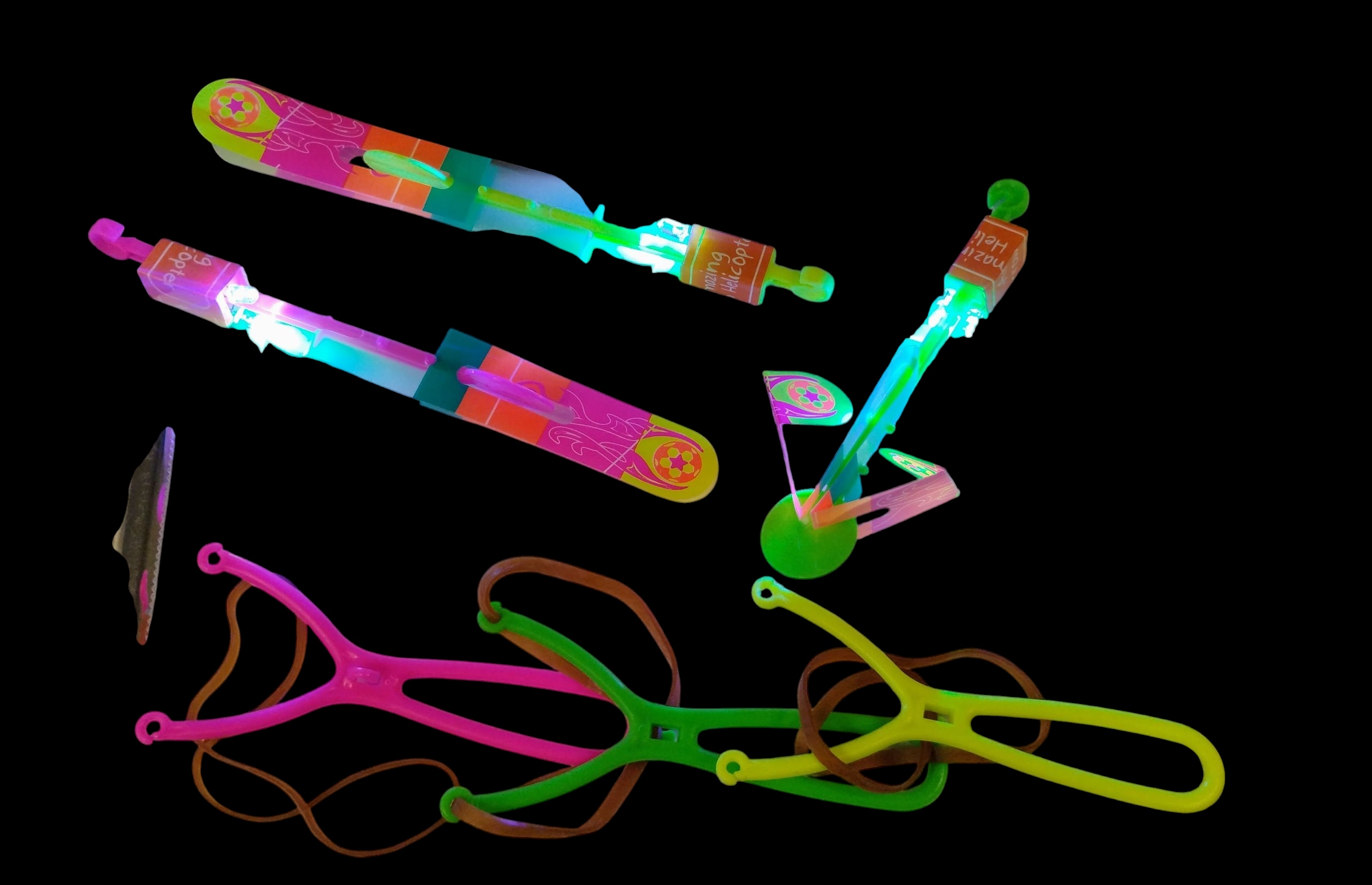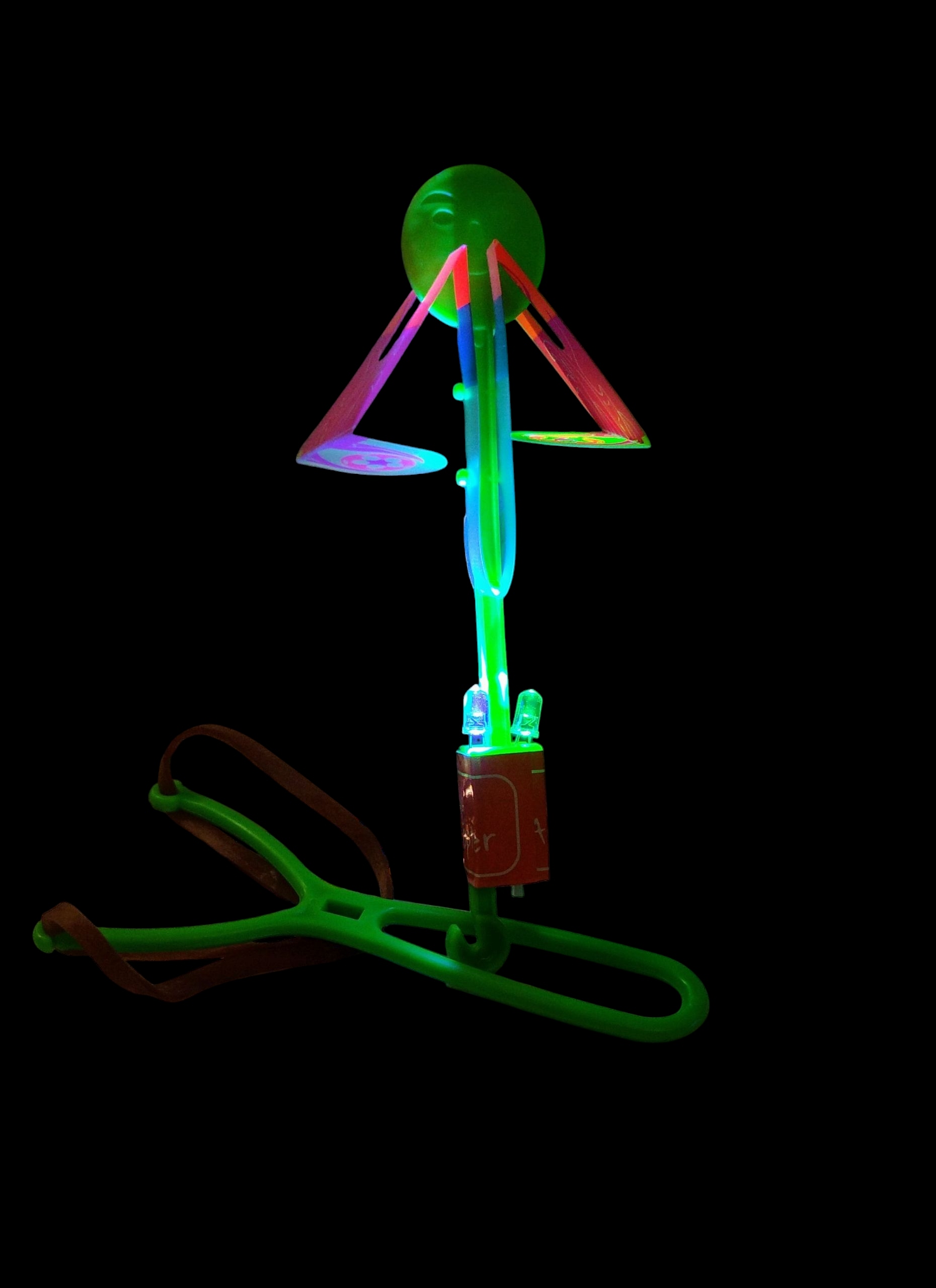 Іграшка складається з еластичної гумки з еластичною смугою, світлодіодним стрижнем та крилами, що імітують гвинти.