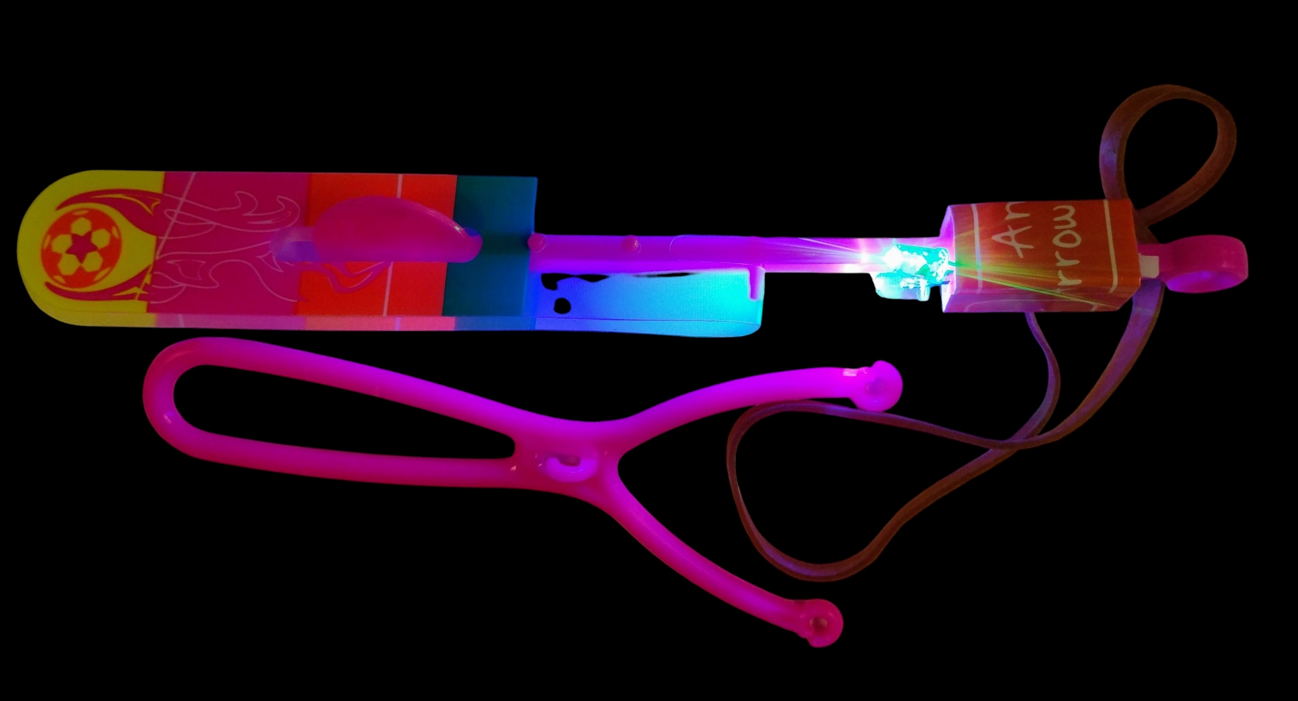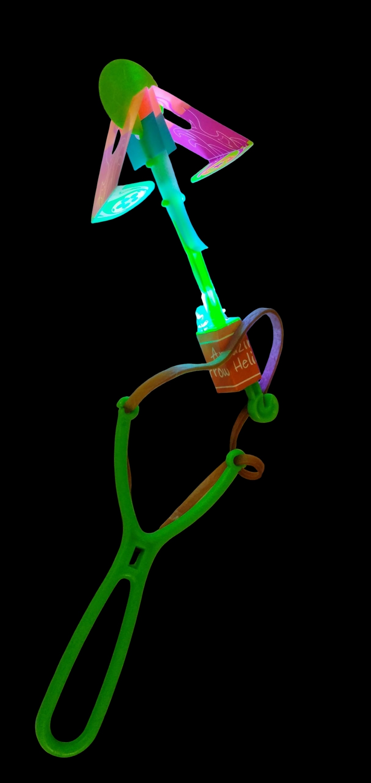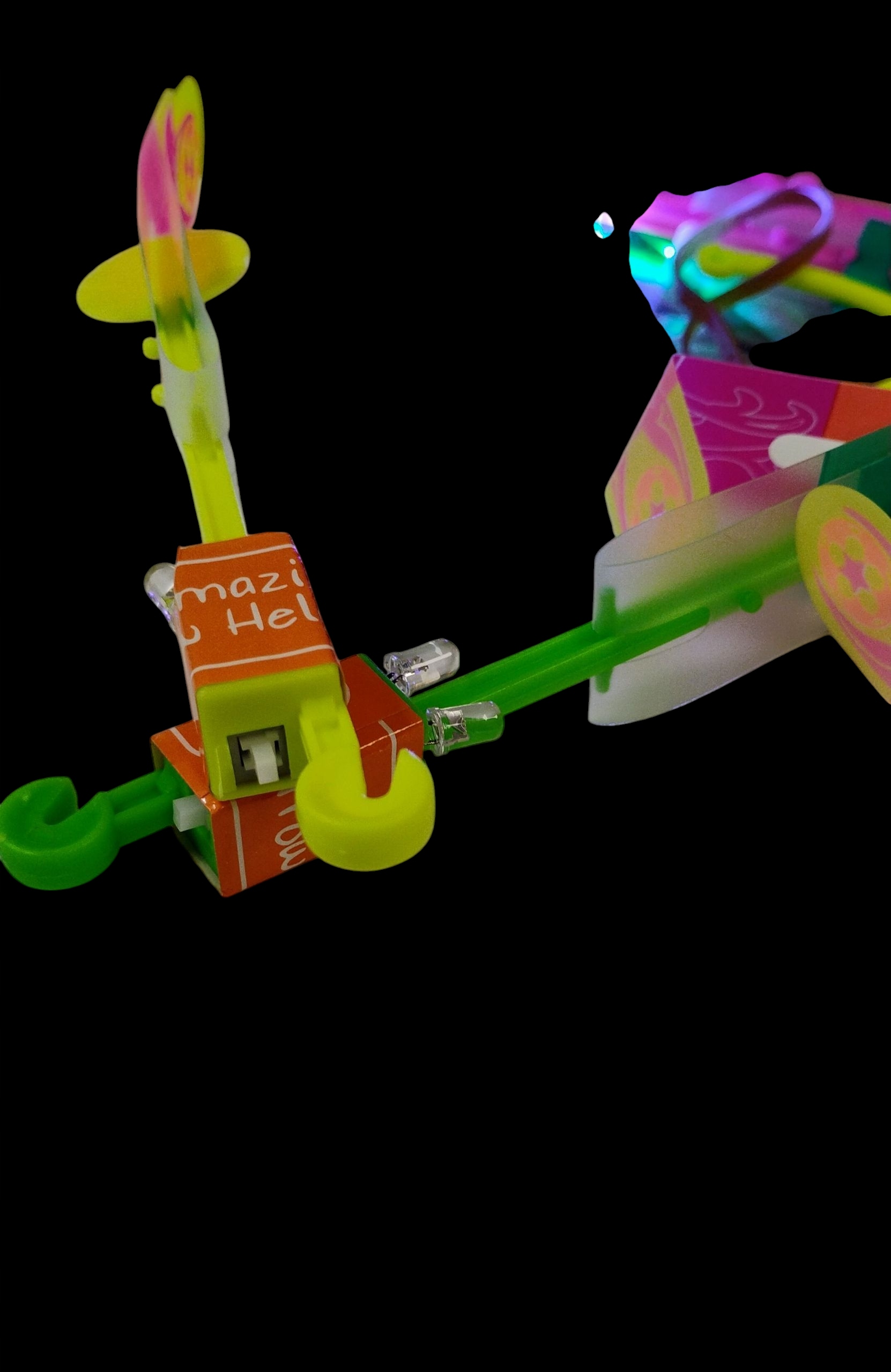 Іграшка складається з еластичної гумки з еластичною смугою, світлодіодним стрижнем та крилами, що імітують гвинти.