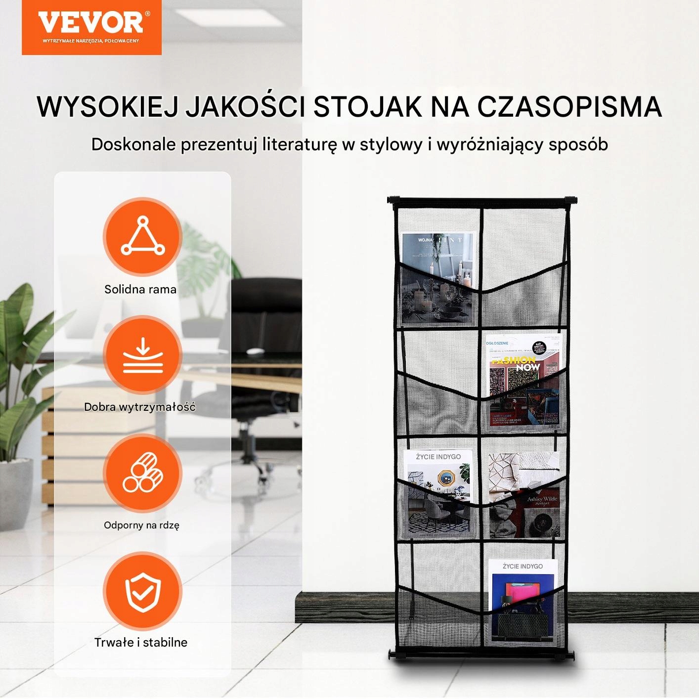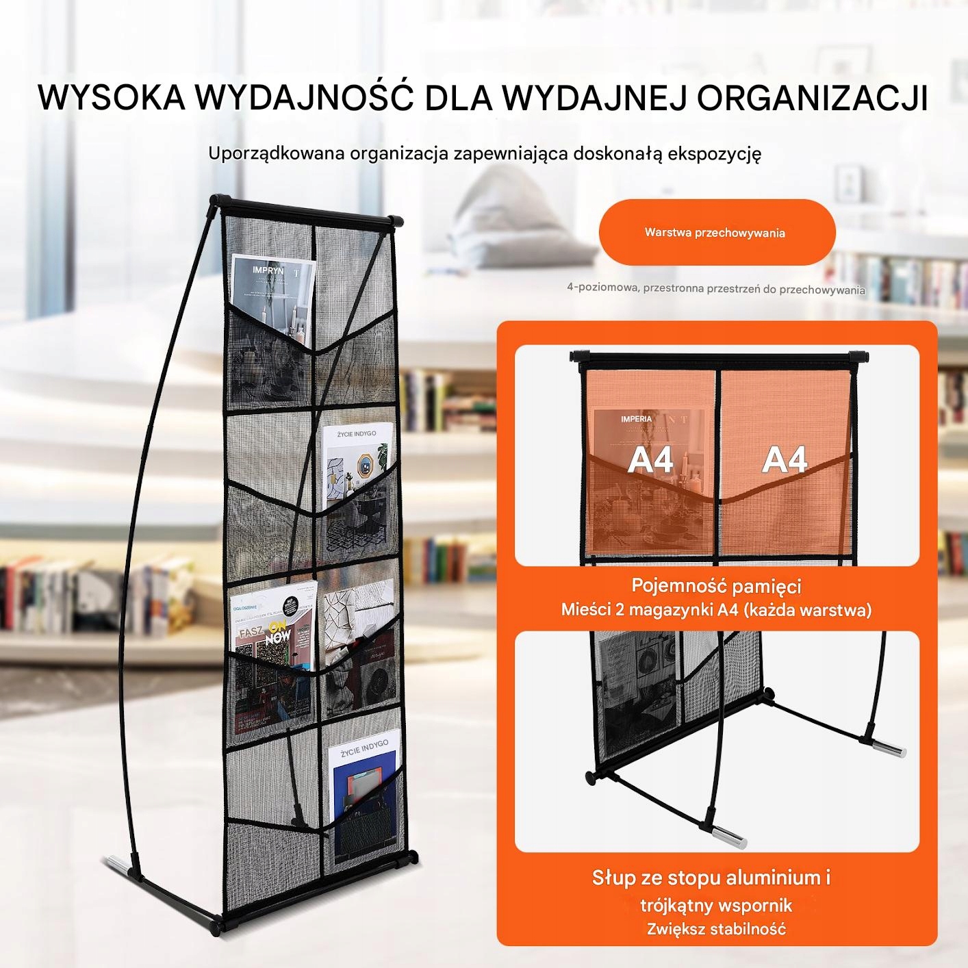 Портативна літературна стійка була розроблена з 2 рядами сітки виставкових кишень із загальною кількістю 8 кишень, що забезпечує достатньо місця для організації листівок, документів, брошур, журналів та інших. Брошури впорядковуються, організовані та легкодоступні.