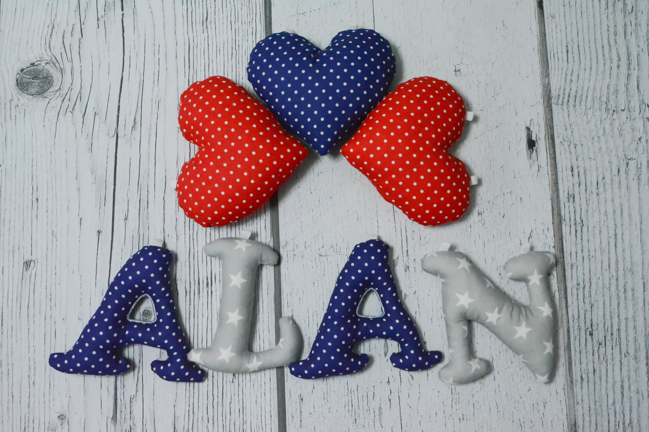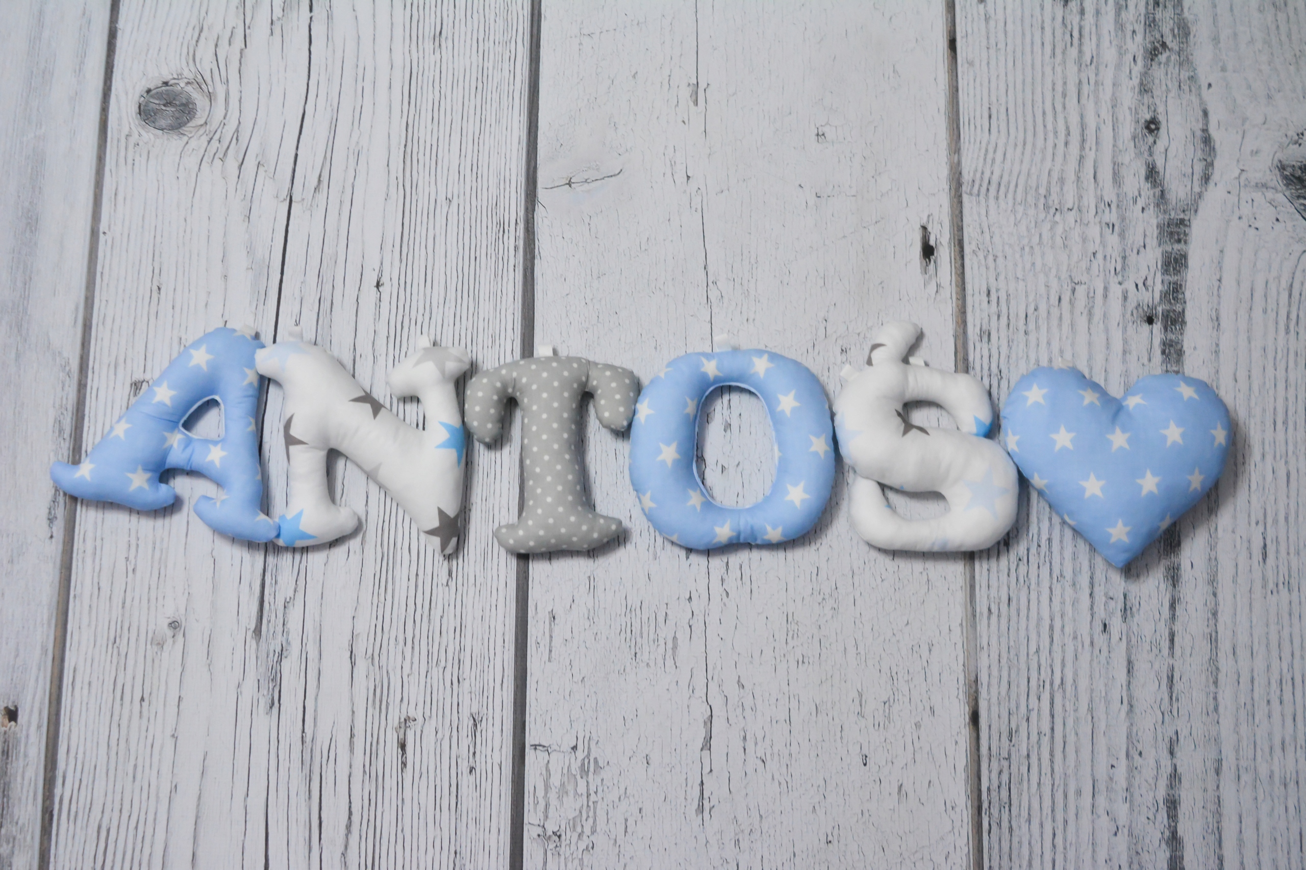 Я пропоную руку -севн -букви зі 100% бавовною, наповненою силіконовою кулькою. Вони чудові як прикраса для дитячої кімнати, щоб повісити на стіну чи ліжечко. Ідеальний подарунок для народження дитини, хрещення, дитячого душу.